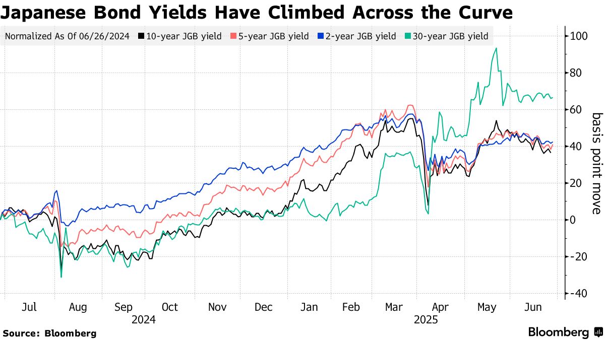 5月下旬國債拍賣遇冷後,日本債券暴跌,30年期和40年期國債收益率攀升至發行以來最高水平。近期市場動盪中,主要債券市場與日本國債同步波動,全球對財政赤字擴大的擔憂加劇了市場混亂。