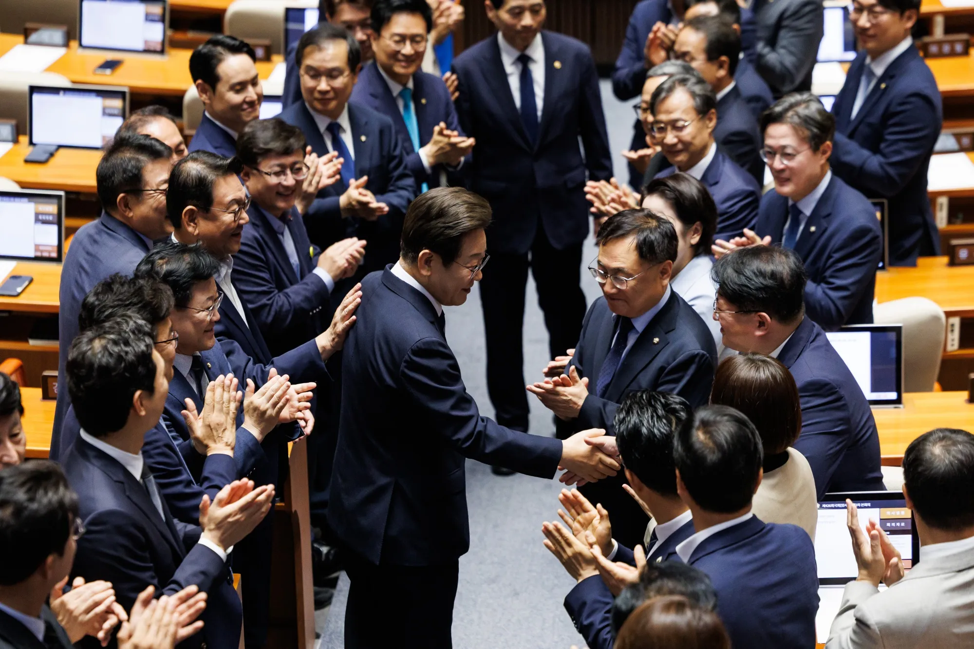 6月26日,李在明在首爾國會與議員們握手。攝影師:趙成俊/彭博社韓國新任總統李在明以高於近期前任的支持率開啓任期,數月政治動盪後經濟復甦的希望正在升温。