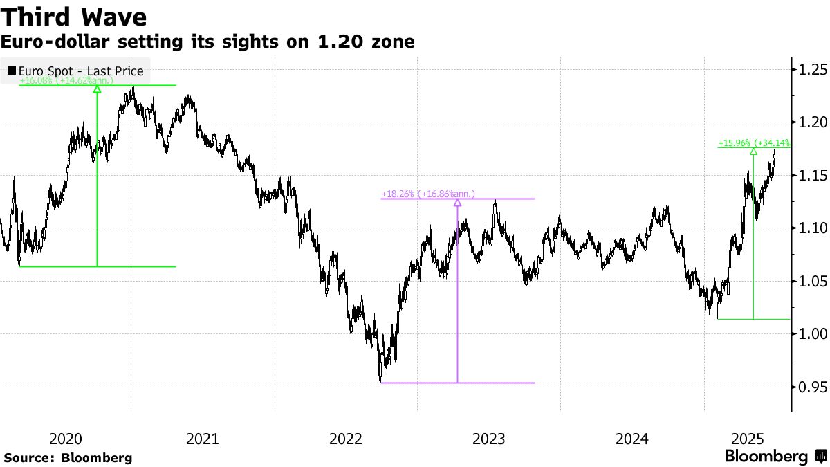 數據顯示,外匯交易員正聚焦歐元看漲期權(當歐元兑美元升值時價值上漲),過去一週押注匯率突破1.20美元的合約量激增。這表明隨着美國貿易戰和不斷加劇的財政擔憂削弱美元需求,新資金正湧入看漲歐元的策略。