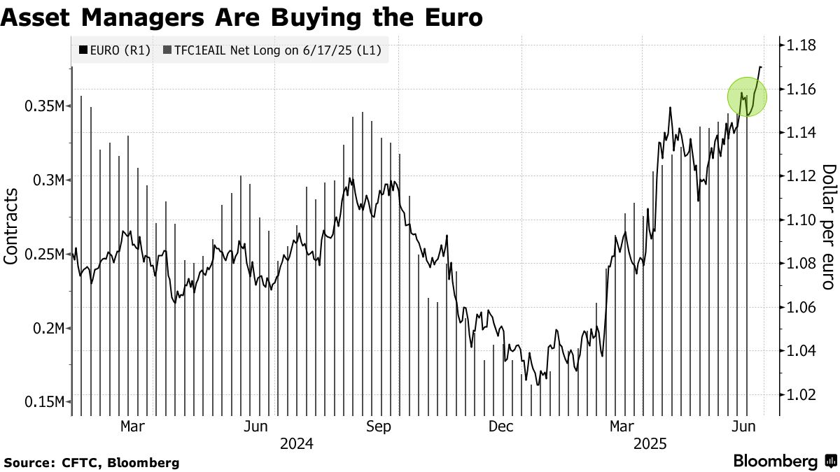 隨着伊朗-以色列停火協議和美聯儲降息預期打壓美元,歐元週四突破1.17關口,創2021年9月以來最強水平。德國曆史性的財政支出計劃也增強了投資者對歐洲終於擺脱多年停滯的信心,為持有歐元提供了更多理由。
