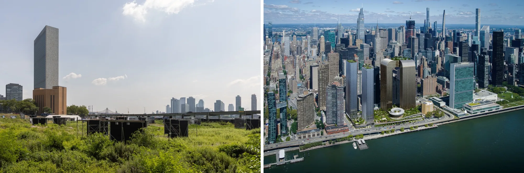 若競標成功,自由廣場將在此地建造。自由廣場效果圖。攝影師:尤夫拉吉·卡納/彭博社。效果圖:索洛維耶夫集團索洛維耶夫集團與摩希根部落合作提出111億美元的自由廣場開發計劃,選址曼哈頓東區聯合國總部南側。項目包含1250間酒店客房、1000多套住宅及5英畝向公眾開放的公園,賭場實際位於地下。