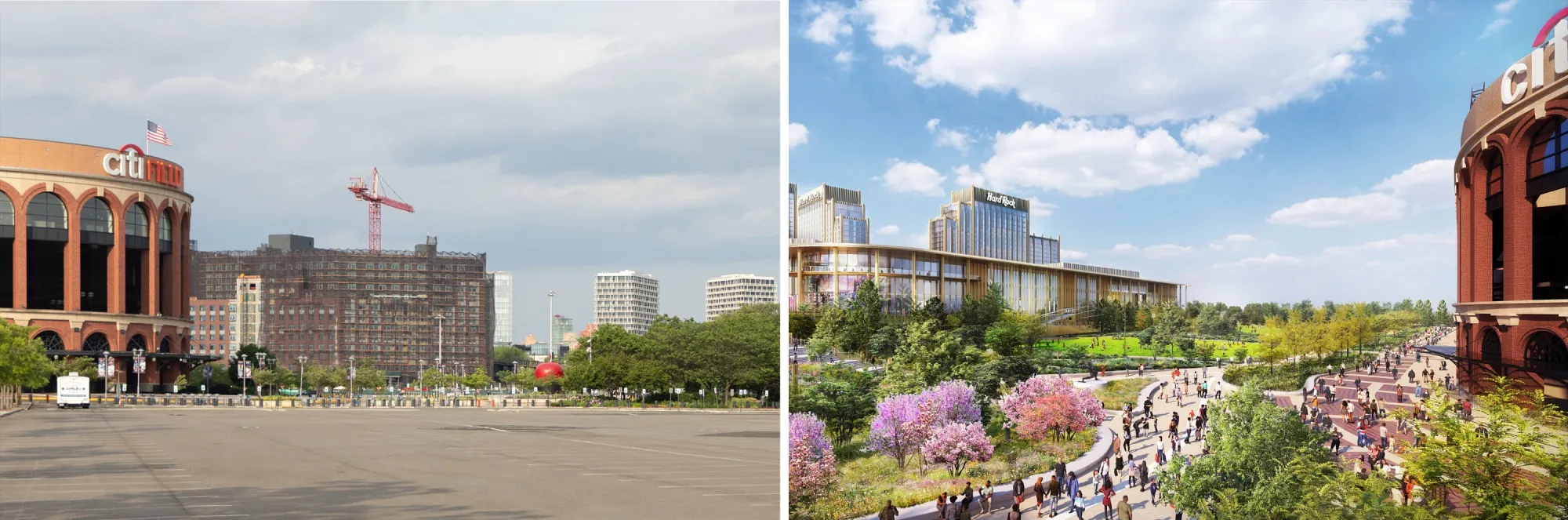 大都會公園提案將在皇后區花旗球場旁建造賭場。效果圖:SHoP建築事務所,Field Operations部分提案已獲得當地政要的關鍵支持,例如億萬富翁科恩在皇后區花旗球場旁建設娛樂綜合體的計劃。該方案將把停車場改造成佔地25英畝(10公頃)的巨型娛樂綜合體,包含公共公園、遊樂場和運動場,並設有皇后區美食廣場、硬石酒店賭場及配備現場音樂廳、酒吧和餐廳的娛樂場所。