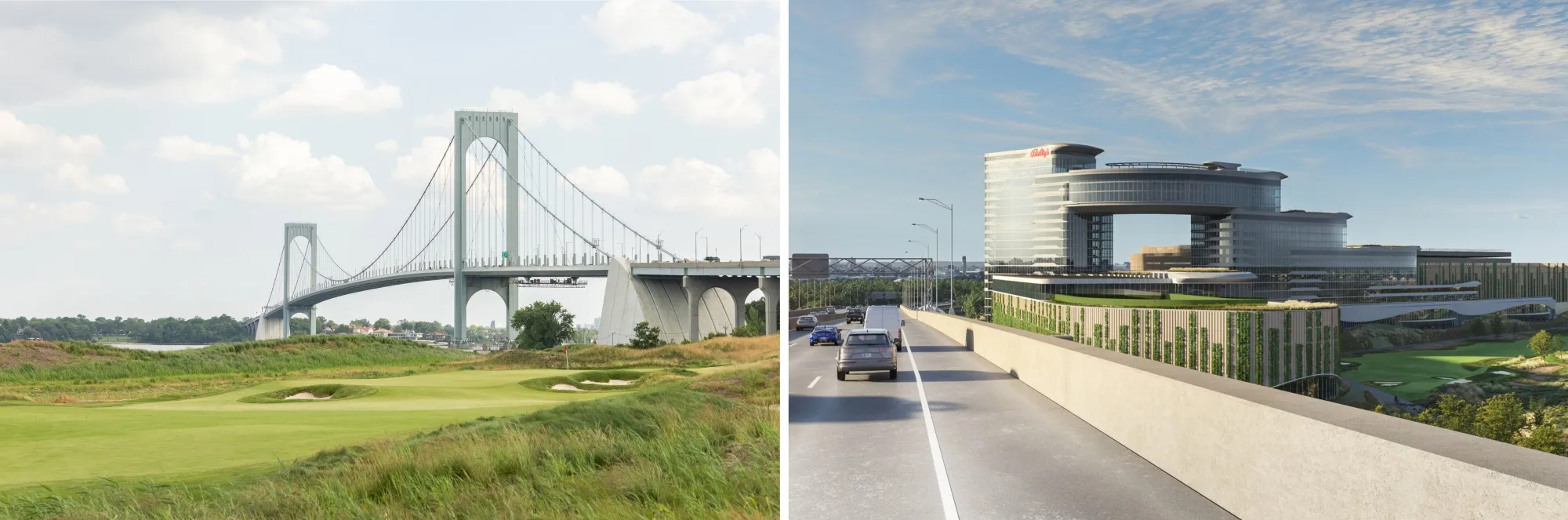 百利提案將保留現址高爾夫球場。攝影師:尤夫拉吉·卡納/彭博社。效果圖:HKS在布朗克斯區,百利公司提出40億美元擴建計劃,擬在現有高爾夫球場基礎上增建500間客房的酒店、2000座娛樂中心、賭場和水療中心。三月間因居民投訴交通隱患,當地社區委員會投票反對該項目,但該表決僅具建議性。本月早些時候,州議會批准百利使用公共公園用地開發,為提案注入新動力。