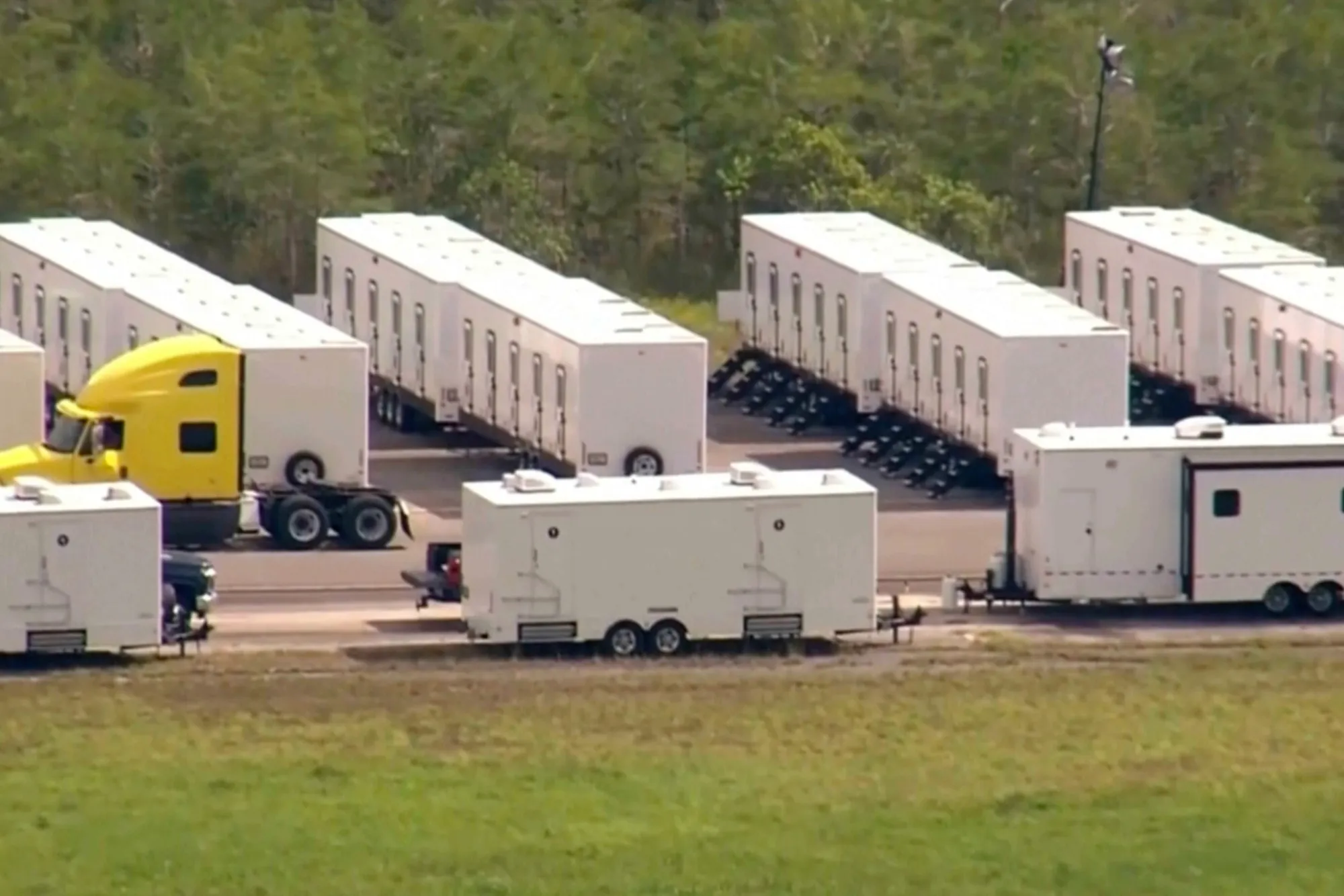 視頻畫面中,位於偏遠大沼澤地機場、綽號"短吻鱷惡魔島"的移民拘留設施內的拖車。