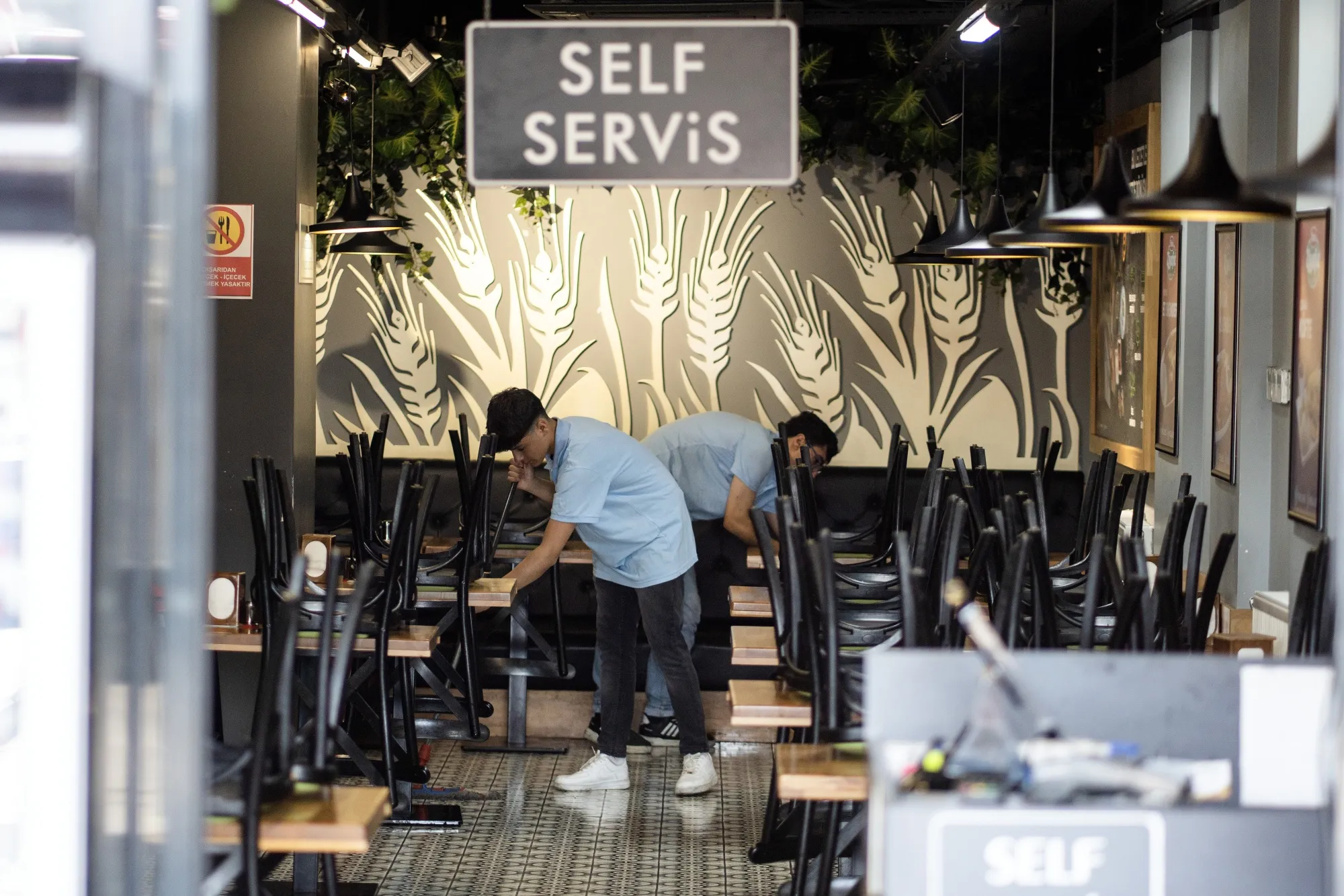 土耳其安卡拉,工作人員正在清潔一家自助餐廳的地面。