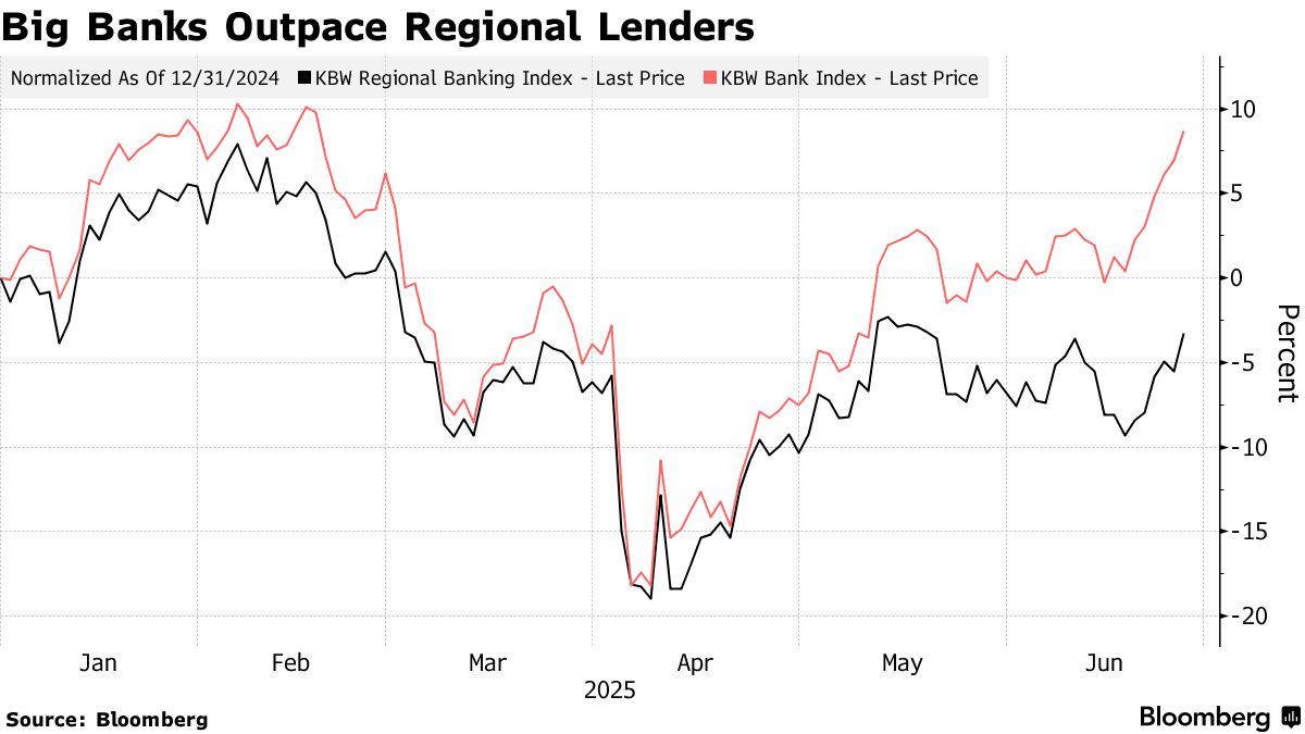 KBW銀行指數自4月初的低點以來已上漲超過30%,當時唐納德·特朗普總統的關税議程引發了市場拋售。同期,地區性同行的漲幅較為温和,為18%,但仍遠低於年初至今的高點。