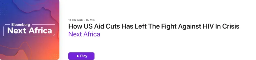 在本週的《非洲前瞻》播客中,聯合國艾滋病規劃署執行主任温妮·比亞尼瑪與彭博社的珍妮絲·丘和詹妮弗·扎巴薩賈共同探討美國削減援助後非洲的艾滋病治療現狀。### 新聞綜述