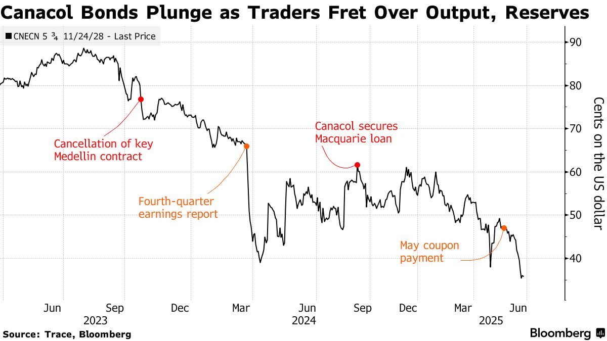 根據彭博彙編的數據,這家總部位於卡爾加里的公司的債券今年迄今已給投資者造成30%的損失。自5月下旬Canacol償還債務以來,2028年到期的債券暴跌近11美分,至35.75美分,跌幅正在加速。