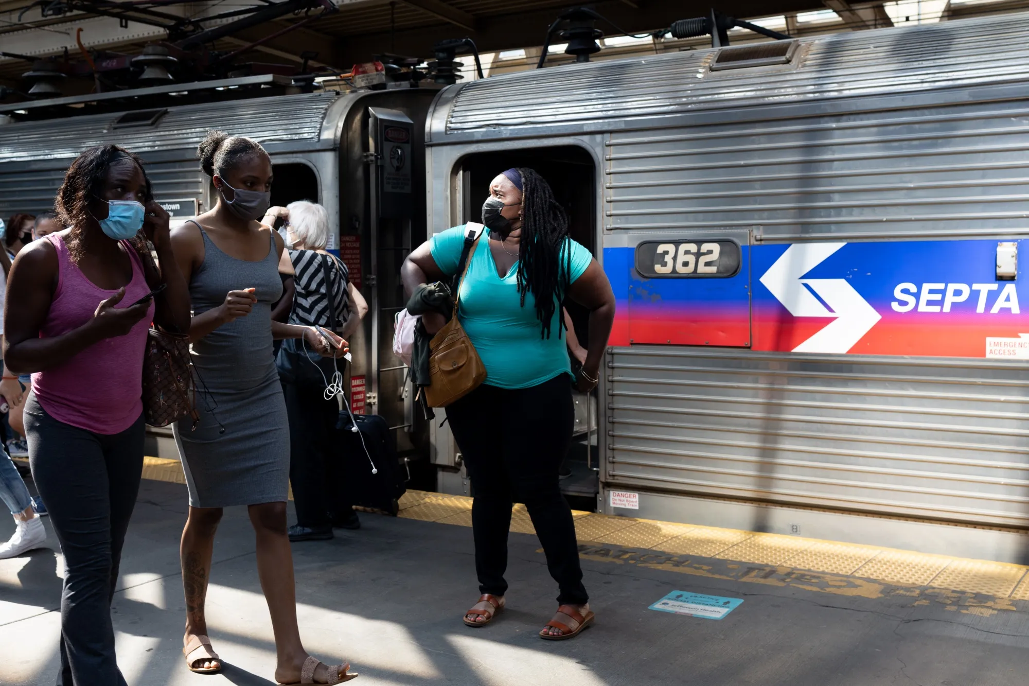 2021年7月30日星期五,乘客們在賓夕法尼亞州費城的一個通勤鐵路站下車。