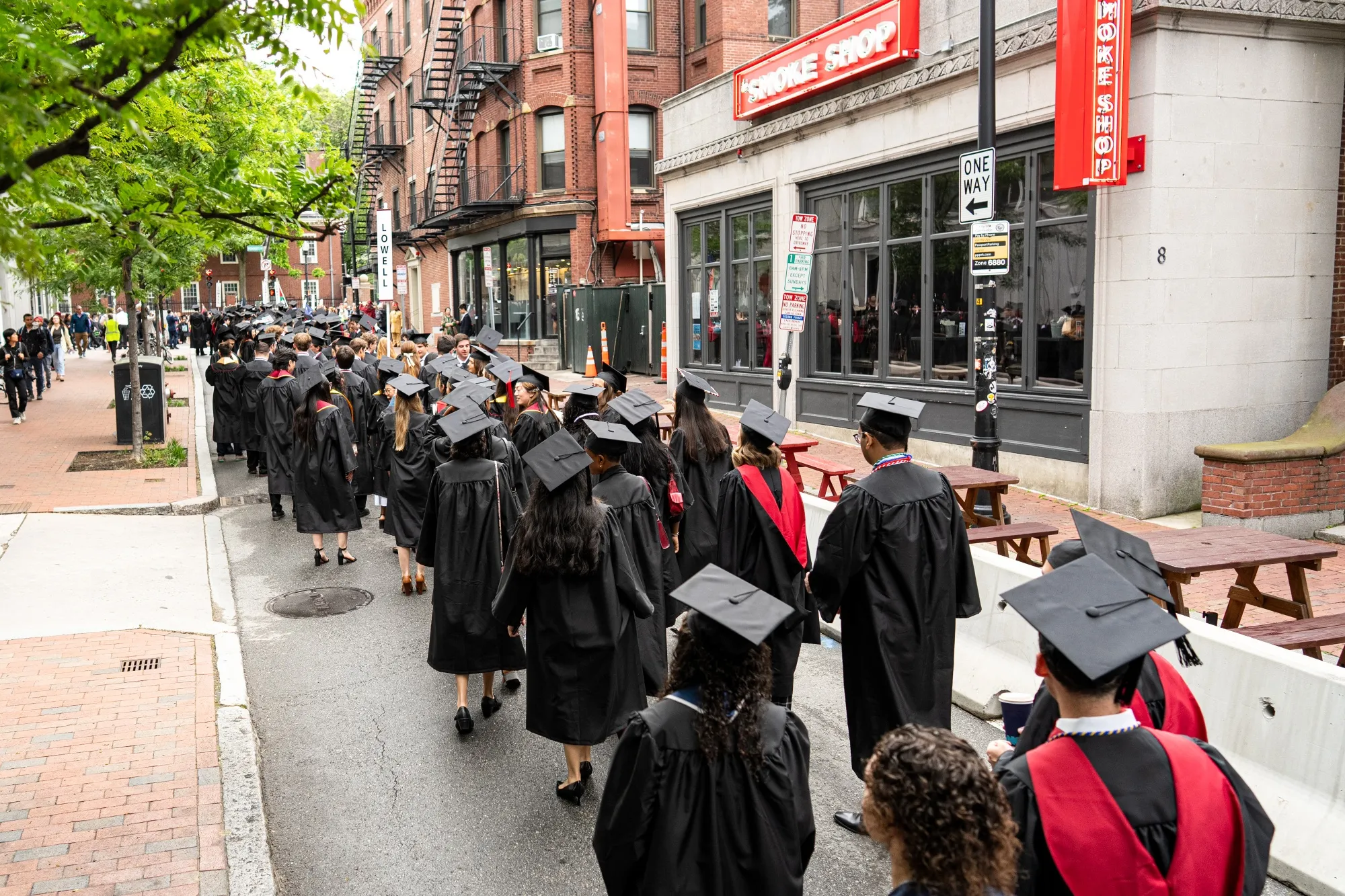哈佛大學畢業生們正穿過馬薩諸塞州劍橋市的哈佛廣場。