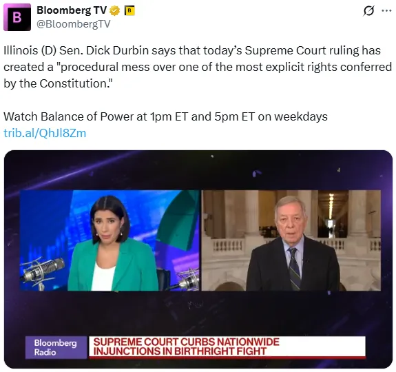 今天下午1點,彭博電視台權力平衡早間版中,主持人喬·馬修和凱莉·萊因茨採訪了伊利諾伊州民主黨參議員、參議院司法委員會資深成員迪克·德賓,討論最高法院今日裁決及對出生公民權的影響。