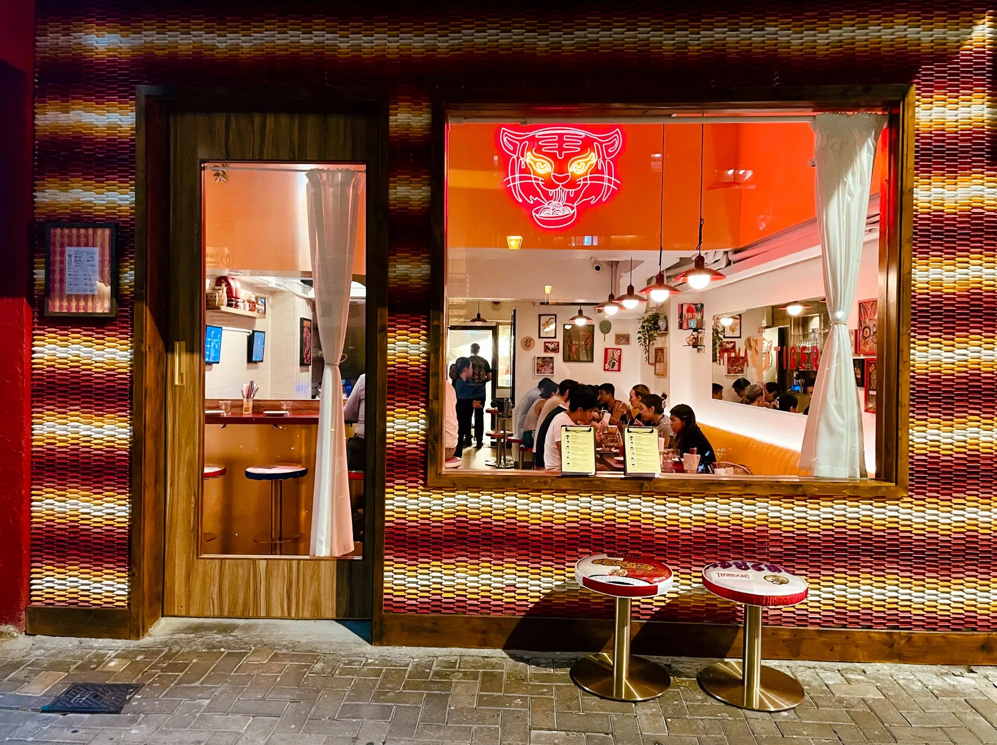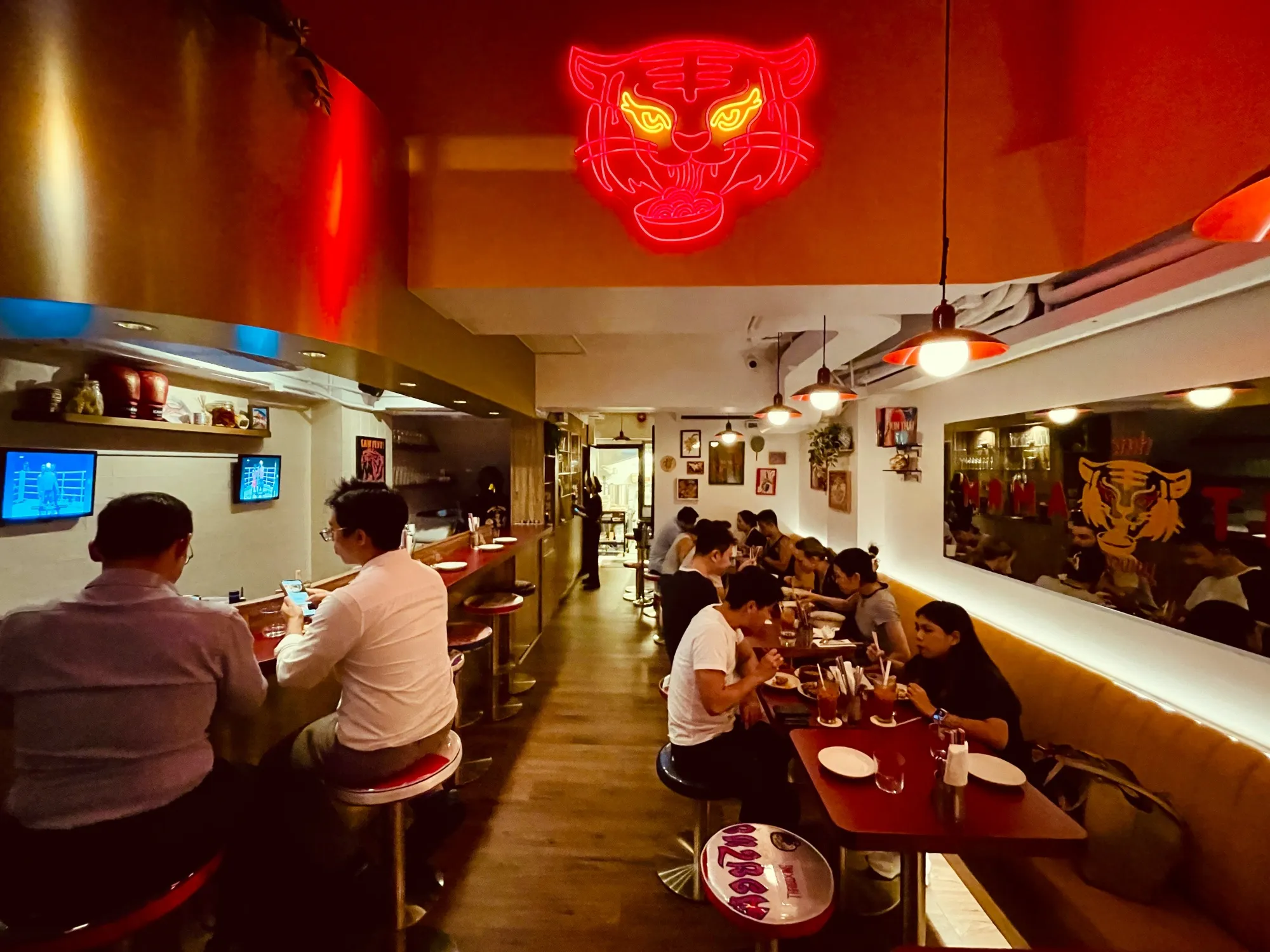 即便從外觀望去,高懸於主用餐區的霓虹虎頭裝置也令人過目難忘。步入室內,挑高天花板營造出超乎預期的開闊感。餐廳設有16個餐桌座位,一側搭配明黃色長沙發,另有8個面朝吧枱的高腳凳。復古海報與照片裝點牆面,音量恰到好處的背景音樂讓人恍若置身1980年代的曼谷夜店。簡而言之:這裏將泰式潮酷餐飲體驗詮釋得淋漓盡致。