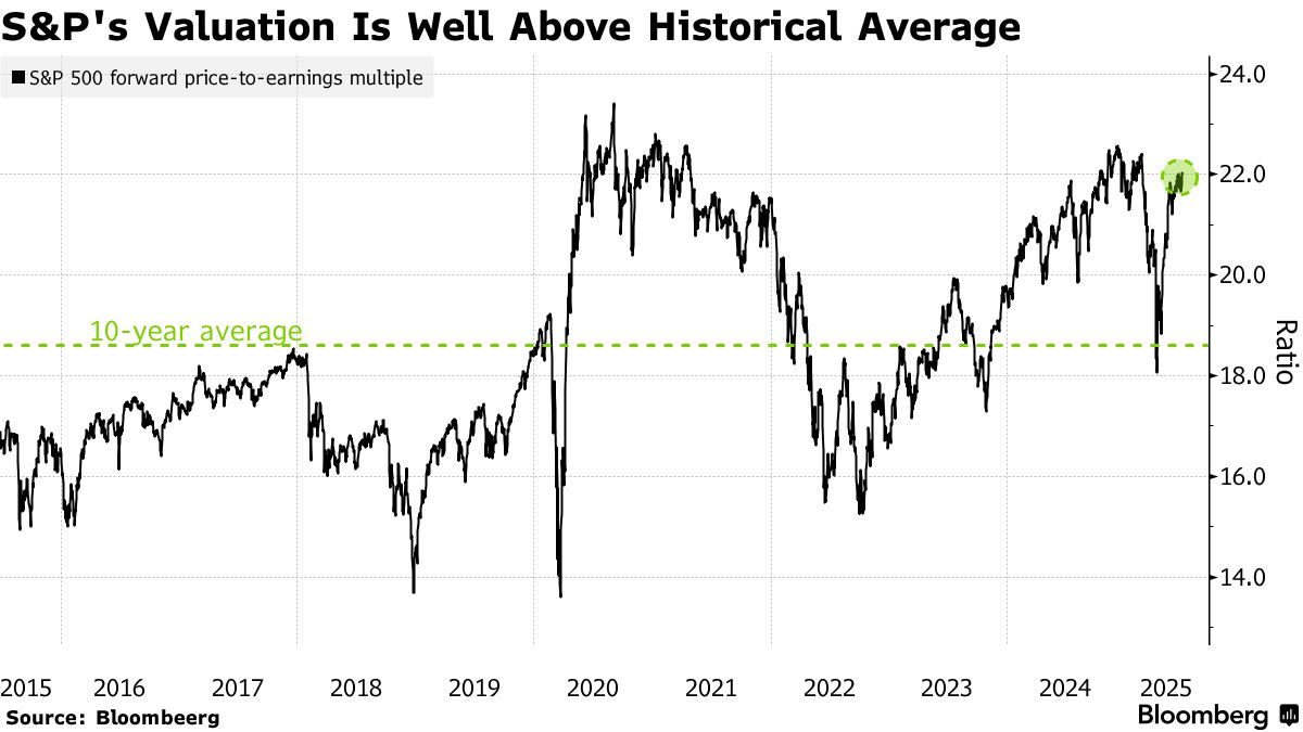目前標普500指數未來12個月市盈率達22倍,遠高於其18.6倍的10年平均水平。威靈頓和聯博等機構預計,由於未來降息預期和大型科技公司的韌性,這一高估值可能持續。但其他投資者認為,過高的估值是進一步增持股票的障礙。