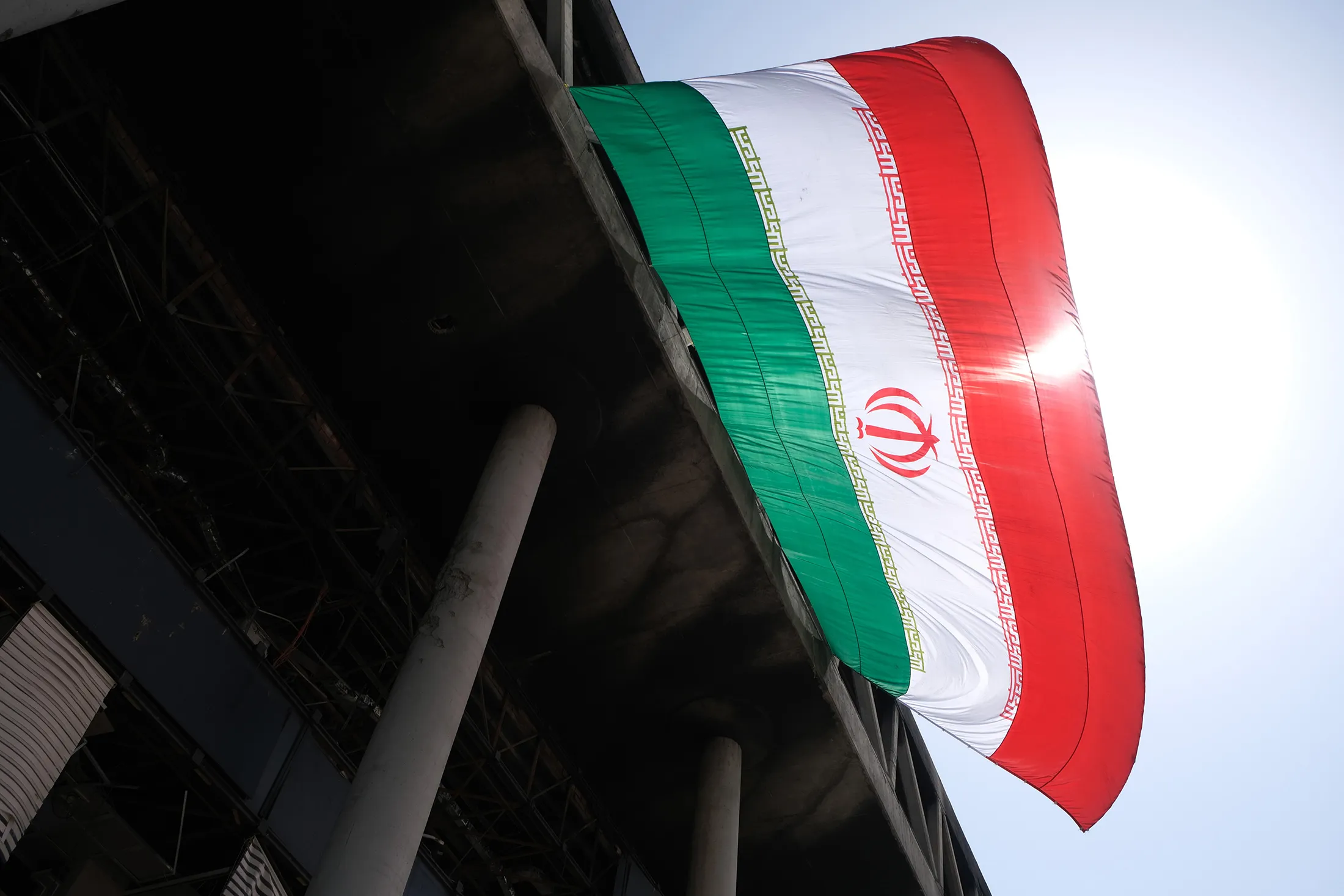 6月25日,伊朗德黑蘭遭以色列導彈襲擊的玻璃建築外牆上懸掛着伊朗伊斯蘭共和國國旗。