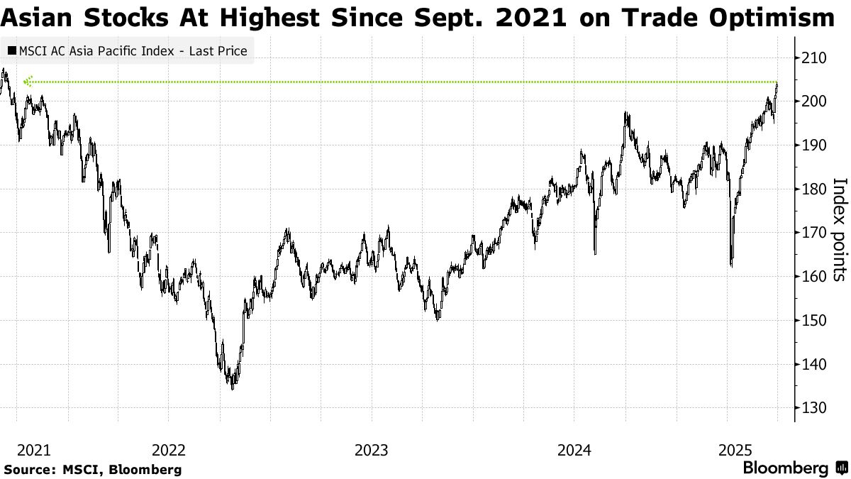 週五美國股市創下自2月份以來首次歷史新高,凸顯市場對經濟抵禦政策不確定性的信心。特朗普4月宣佈對數十個貿易伙伴暫停加徵關税三個月,為股市注入動力。亞洲股市指標有望連續第二個月上漲超4%,貨幣則有望創四年最佳連漲紀錄。