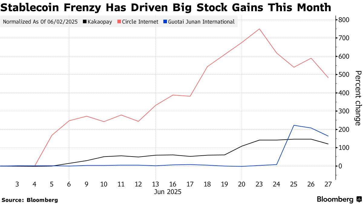 做空Circle Internet集團的押注持續增加,儘管該公司在紐約上市僅三週股價就暴漲約500%。在韓國,全球和本地基金紛紛拋售Kakaopay公司股票,這些股票在過去一個月裏翻了三倍。