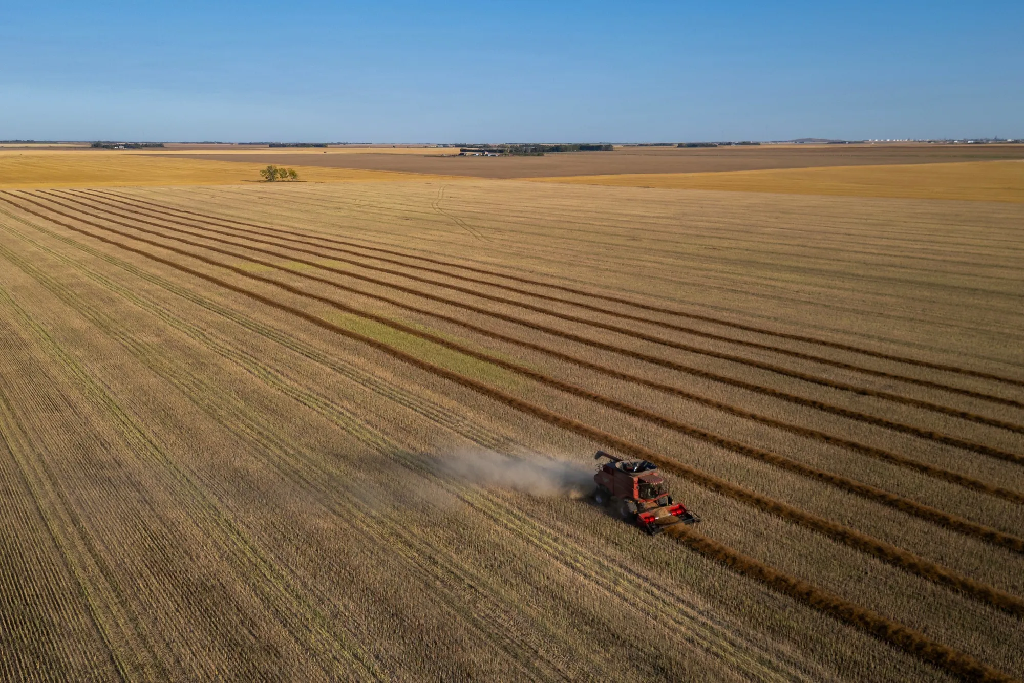 加拿大薩斯喀徹温省布羅拉附近,聯合收割機正在收割油菜籽。