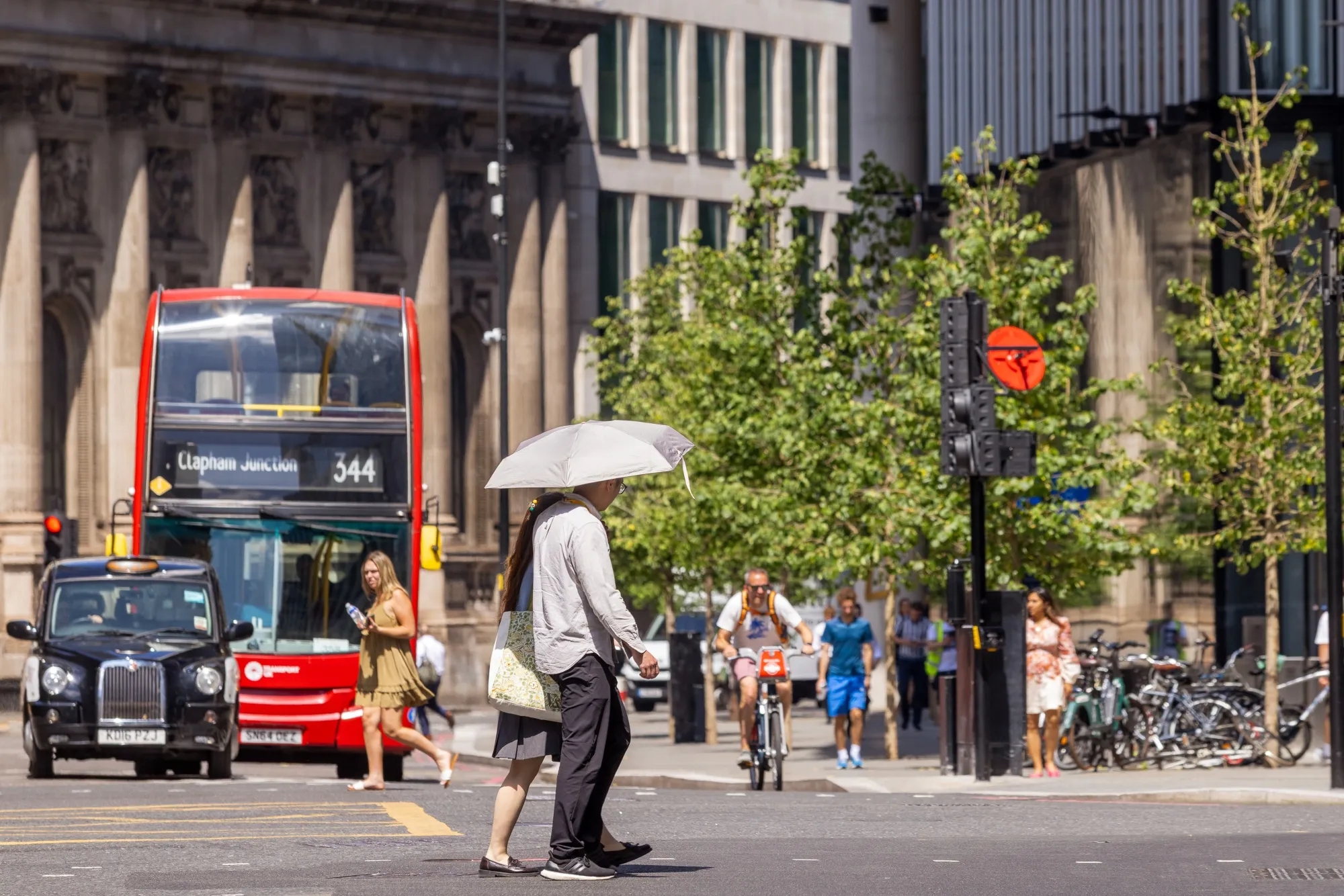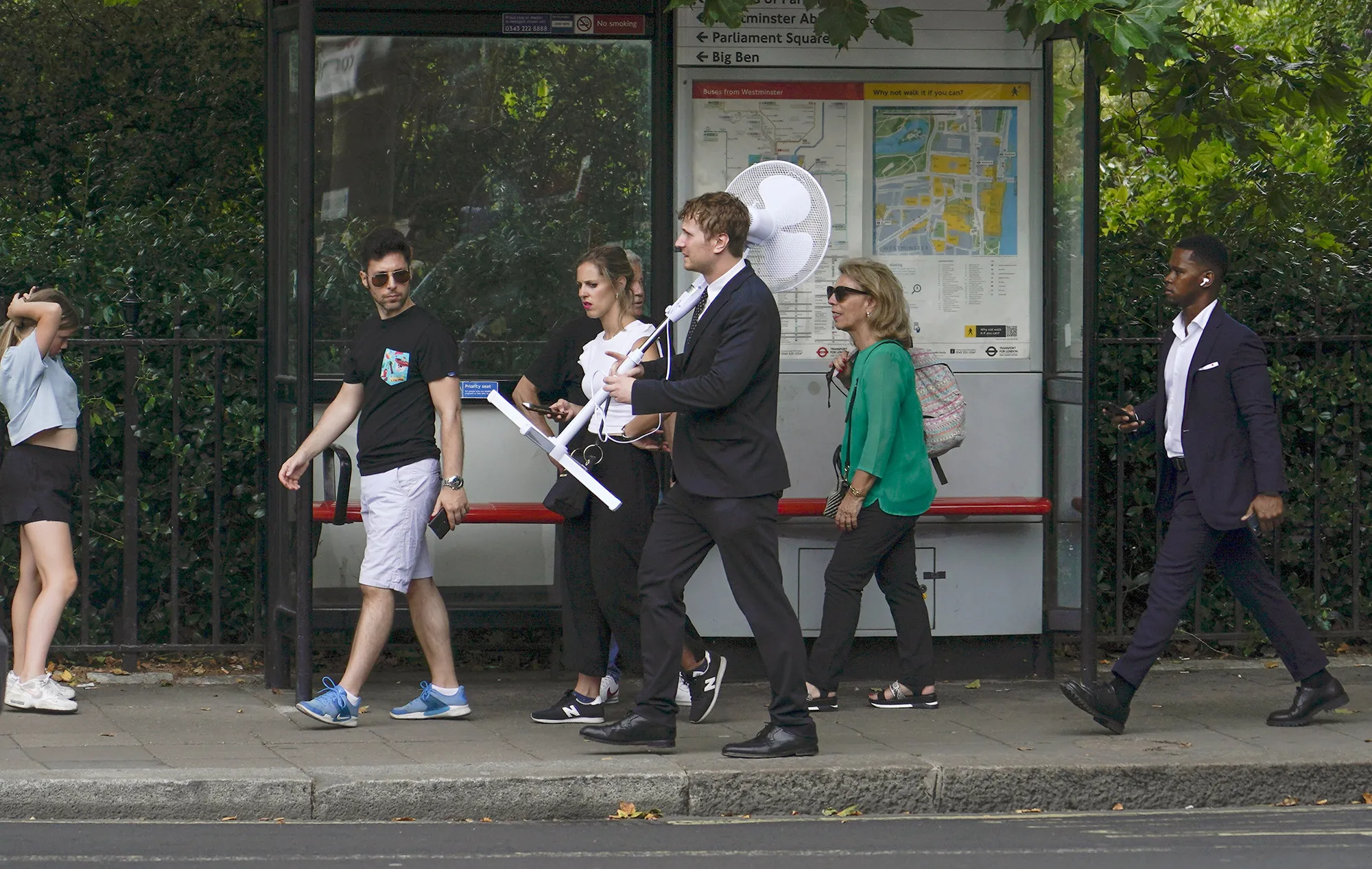 由於官方數據難以獲取,彭博新聞社決定自己動手測量。在上一次熱浪期間,在金融城,你可以聞到柏油燃燒的味道,工人們從Robert Dyas購買了新空調,正步行回家。