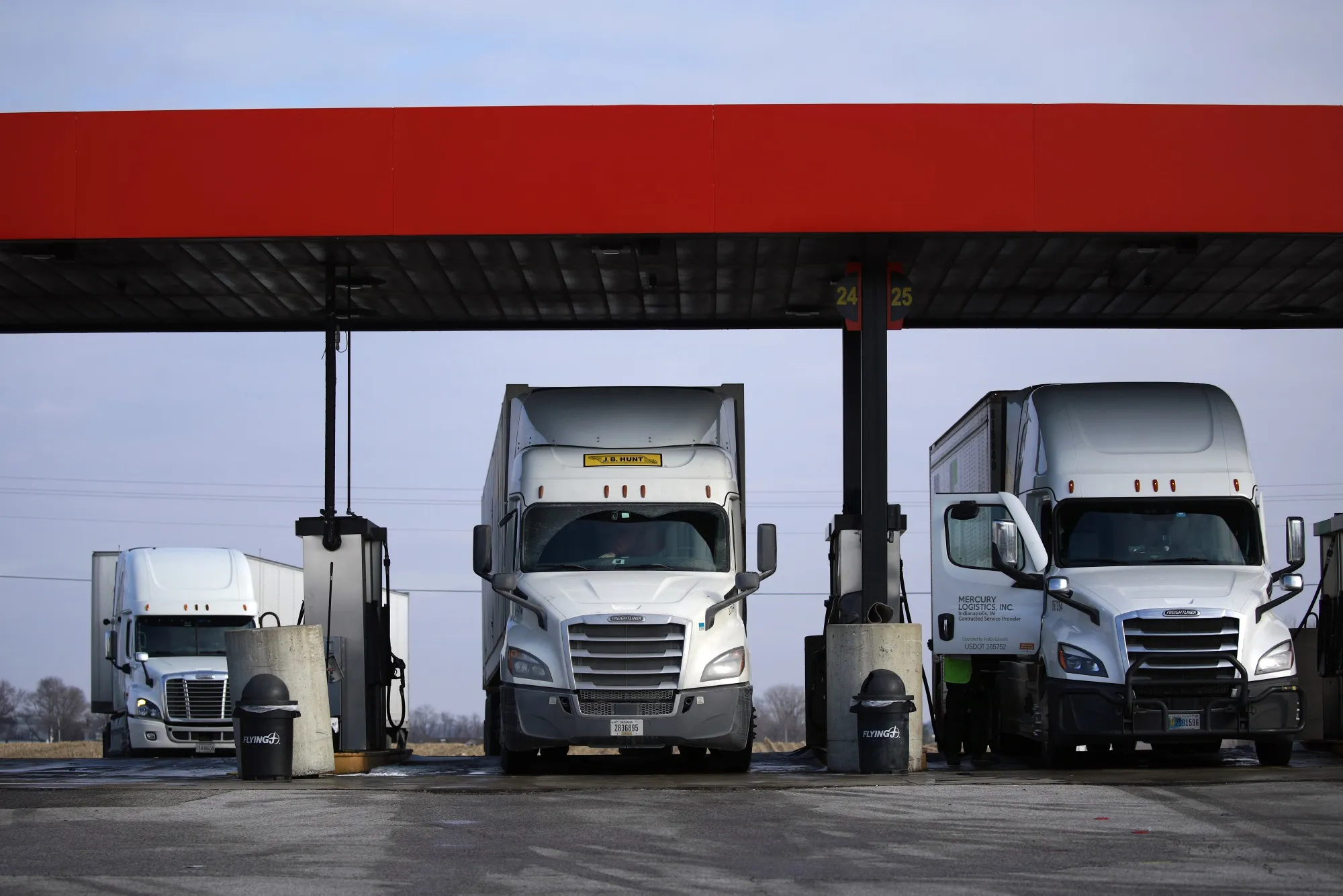 印第安納州懷特蘭一處卡車停靠站的燃油泵旁停放着牽引拖車。