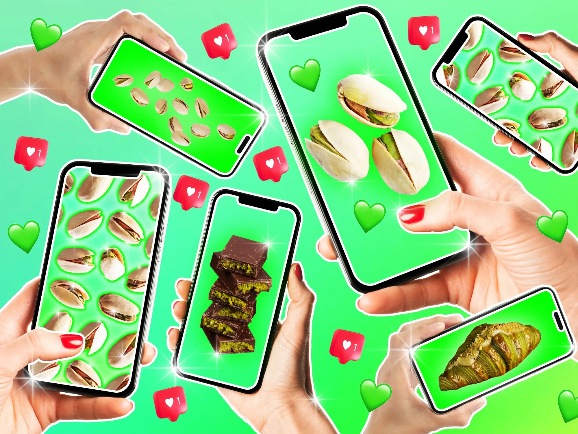 部分得益於這種強大的視覺吸引力,各種形式的開心果正迎來高光時刻。阿聯酋巧克力店Fix Dessert Chocolatier推出"迪拜巧克力”——一種夾着黏稠開心果醬的巧克力棒,該產品迅速走紅並引發全球無數模仿——之後一年半里,這種堅果席捲社交媒體和餐廳菜單,不僅出現在糖果中,還現身於糕點、濃縮咖啡飲品、意大利麪等美食裏。Yelp公司數據顯示,過去一年食客興趣激增:2024年6月至2025年5月期間,“開心果"搜索量較去年同期增長超一倍,“開心果拿鐵"上漲128%,“開心果巧克力"更是暴增8942%。