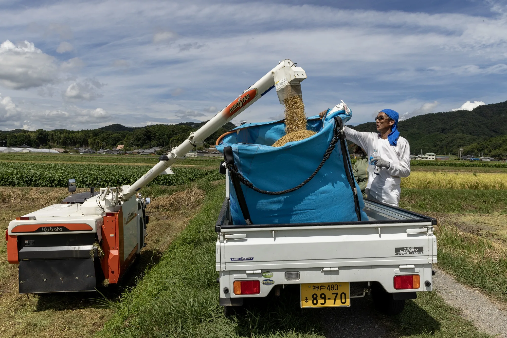 日本丹波筱山市,一名農民正在田間收割水稻。