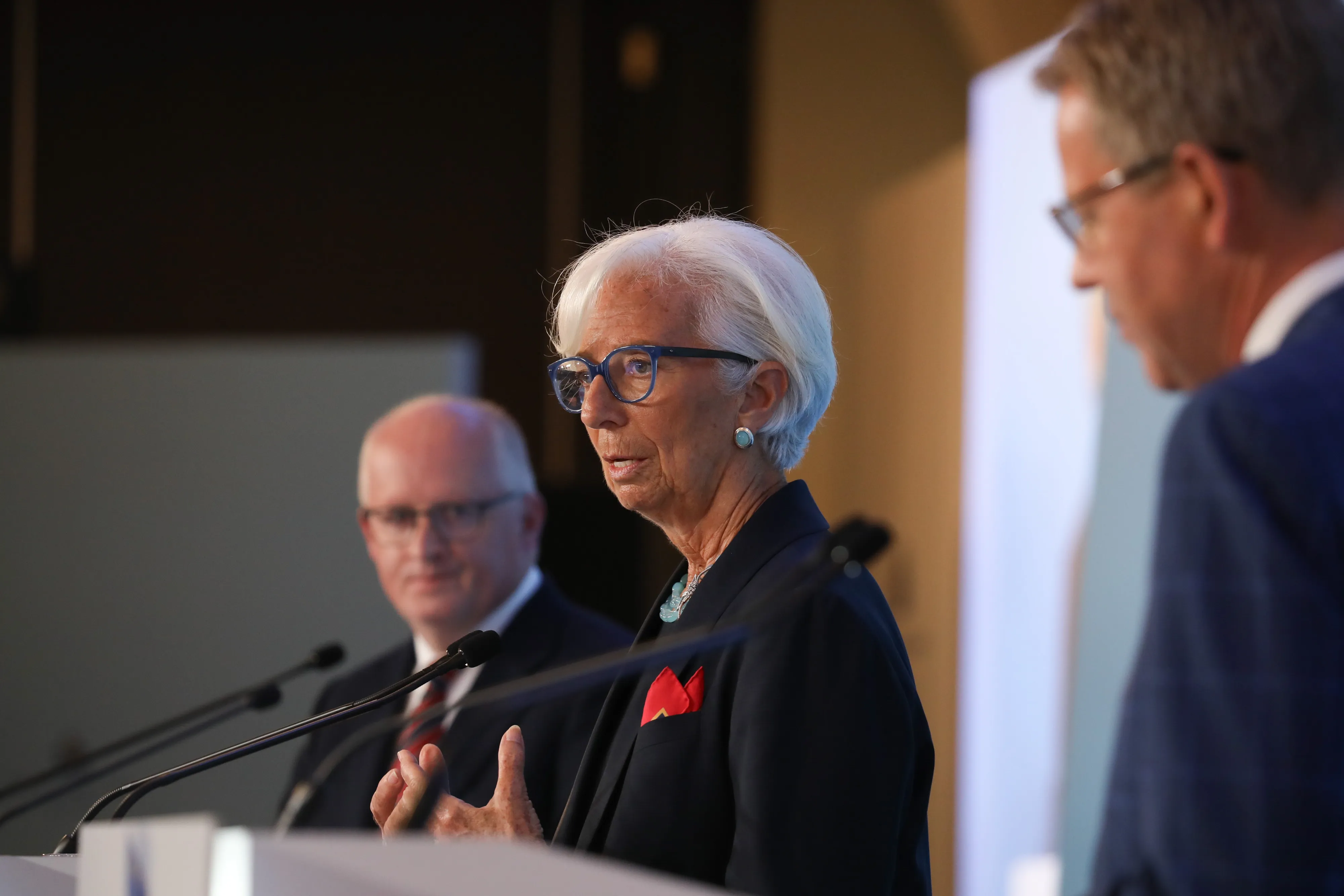 歐洲央行行長克里斯蒂娜·拉加德(中)於週一在葡萄牙辛特拉的歐洲央行中央銀行論壇新聞發佈會上。