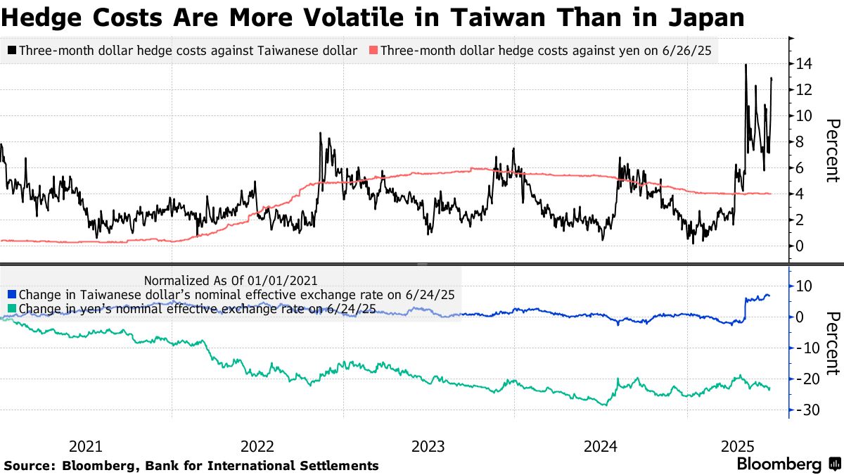 五月間新台幣對美元匯率暴漲逾6%,迫使當地保險公司要麼支付高額成本對沖貨幣進一步升值風險,要麼面臨其約7800億美元海外資產賬面虧損擴大的風險。