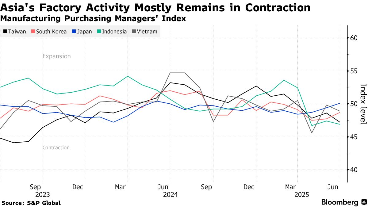 亞洲製造業活動放緩在6月進一步加劇,這為該地區的增長前景敲響警鐘,因為對美出口商品關税將於下週上調。