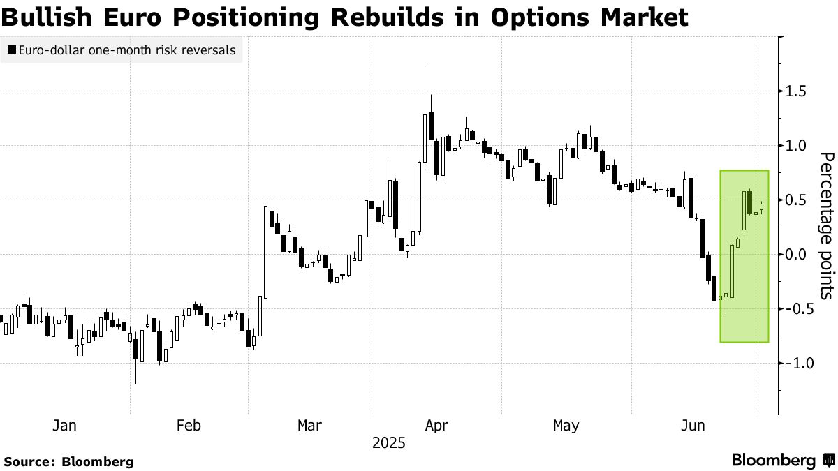 期權交易員持續加碼看漲頭寸。被視為市場情緒風向標的風險逆轉指標上週錄得年度第三大看漲調價。美國存管信託和清算公司數據顯示,過去一週近三分之二的期權合約押注歐元走強。