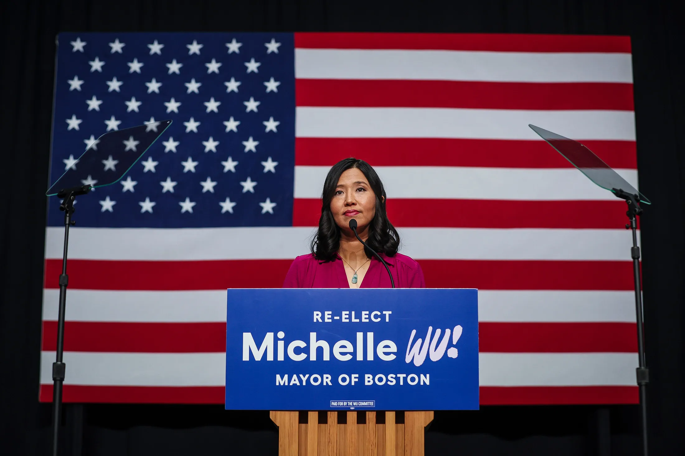 波士頓市長吳弭在四月份波士頓的連任競選啓動活動上。攝影師:埃琳·克拉克/《波士頓環球報》/蓋蒂圖片社閲讀更多:華爾街在馬姆達尼震驚勝選後哀嘆“紅色酷暑之夏”