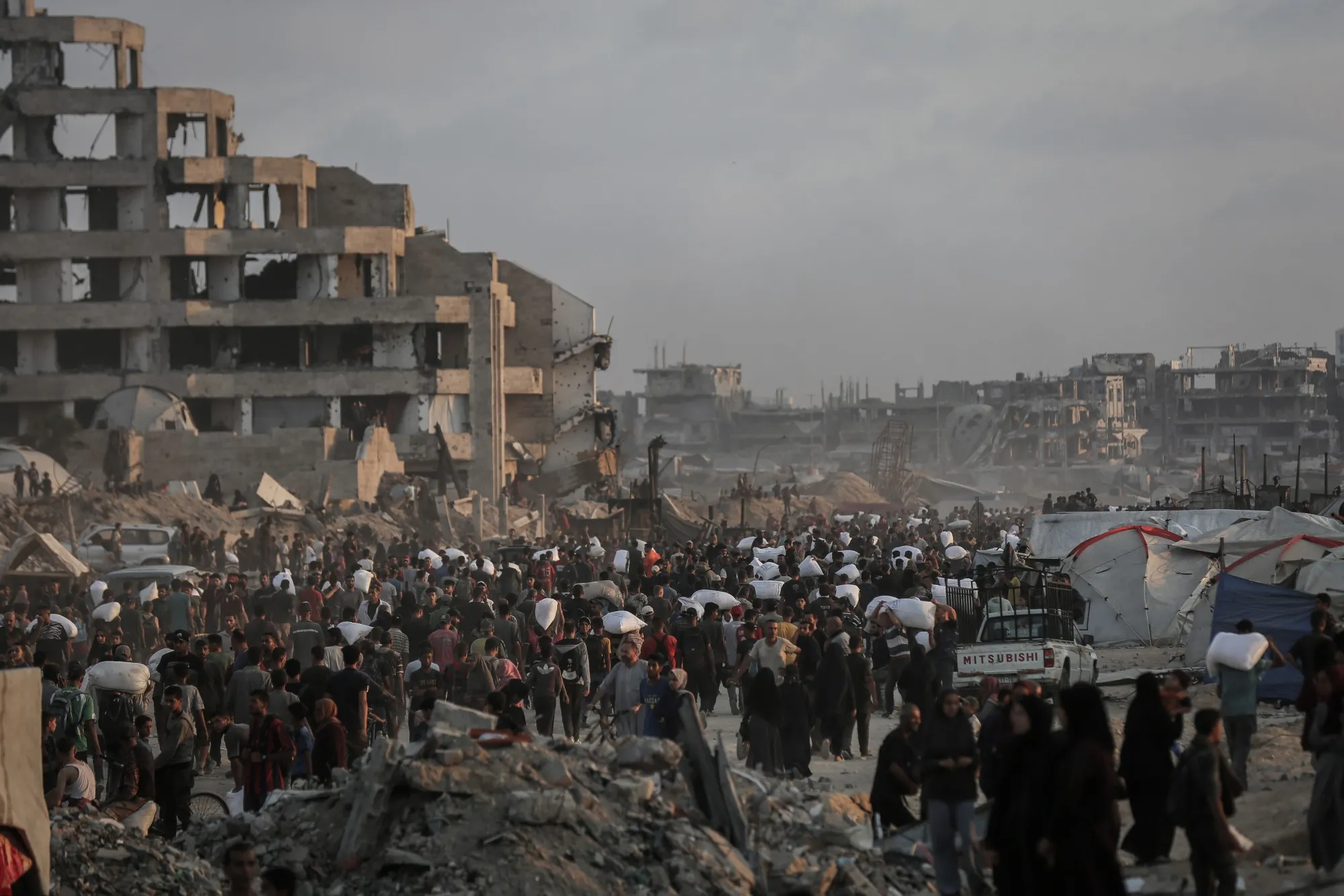 6月,巴勒斯坦人從加沙北部拜特拉希亞的援助分發點搬運麪粉袋。
