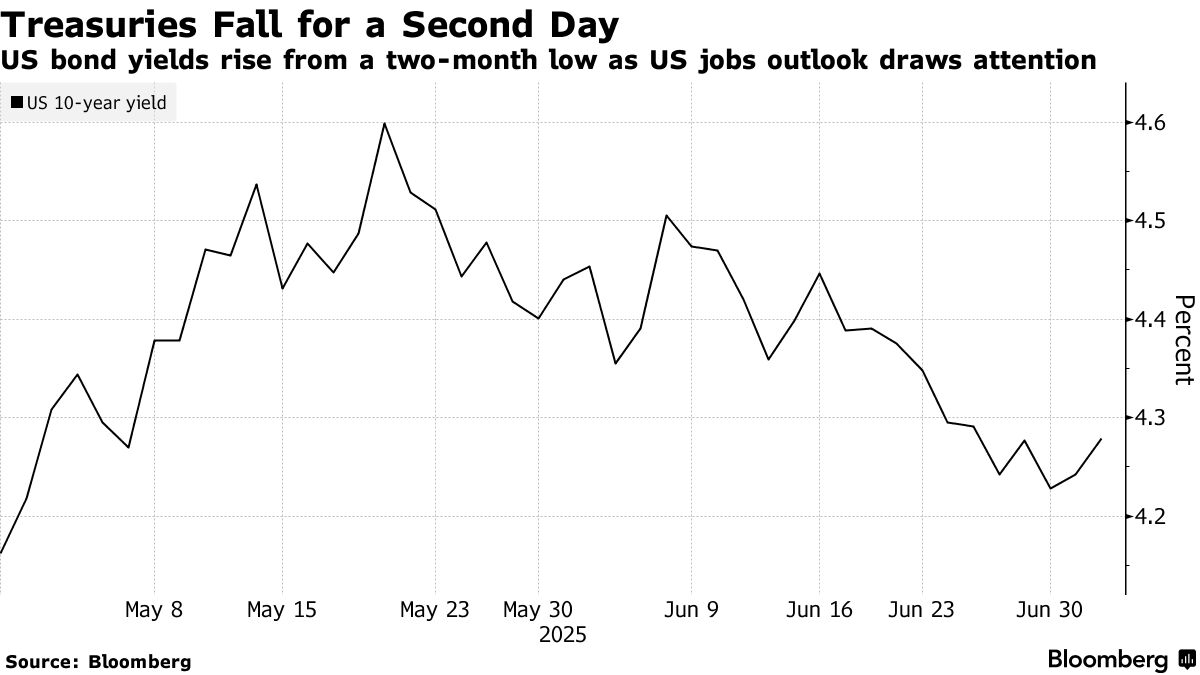 投資者還面臨唐納德·特朗普總統全面預算案的衝擊,該法案週二以微弱優勢通過參議院投票,將對財政赤字產生影響。眾議院計劃週三進行表決,共和黨正加緊在總統設定的7月4日期限前完成立法程序。