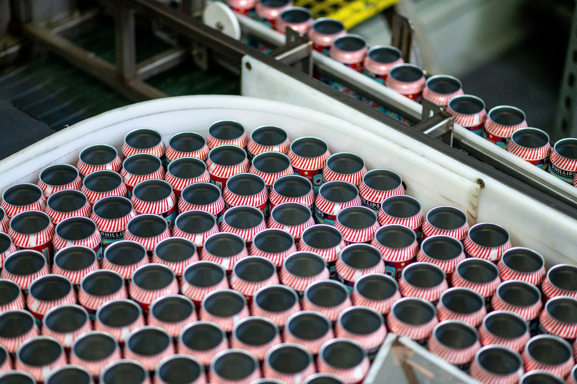 鋁罐進入傳送帶系統。