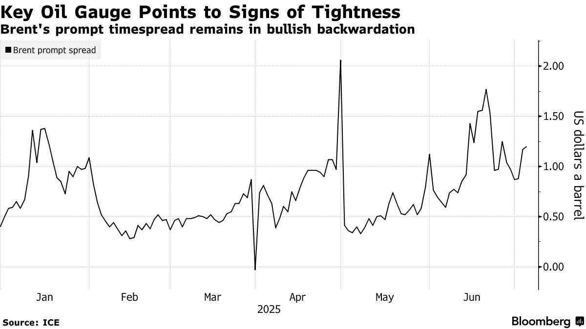 受到廣泛關注的市場指標顯示,持續的熱浪和美國的駕駛季節支撐了需求。布倫特原油的近期價差(即兩個最近合約之間的差距)在現貨溢價中為每桶1.20美元。雖然這低於上個月以色列和伊朗戰爭期間的高位,但比一個月前的69美分有所上升。