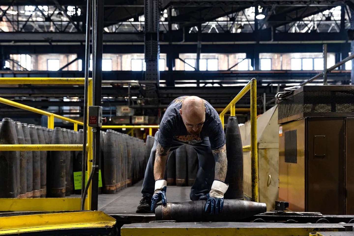 賓夕法尼亞州斯克蘭頓陸軍彈藥廠的工人正在生產車間搬運155毫米炮彈。