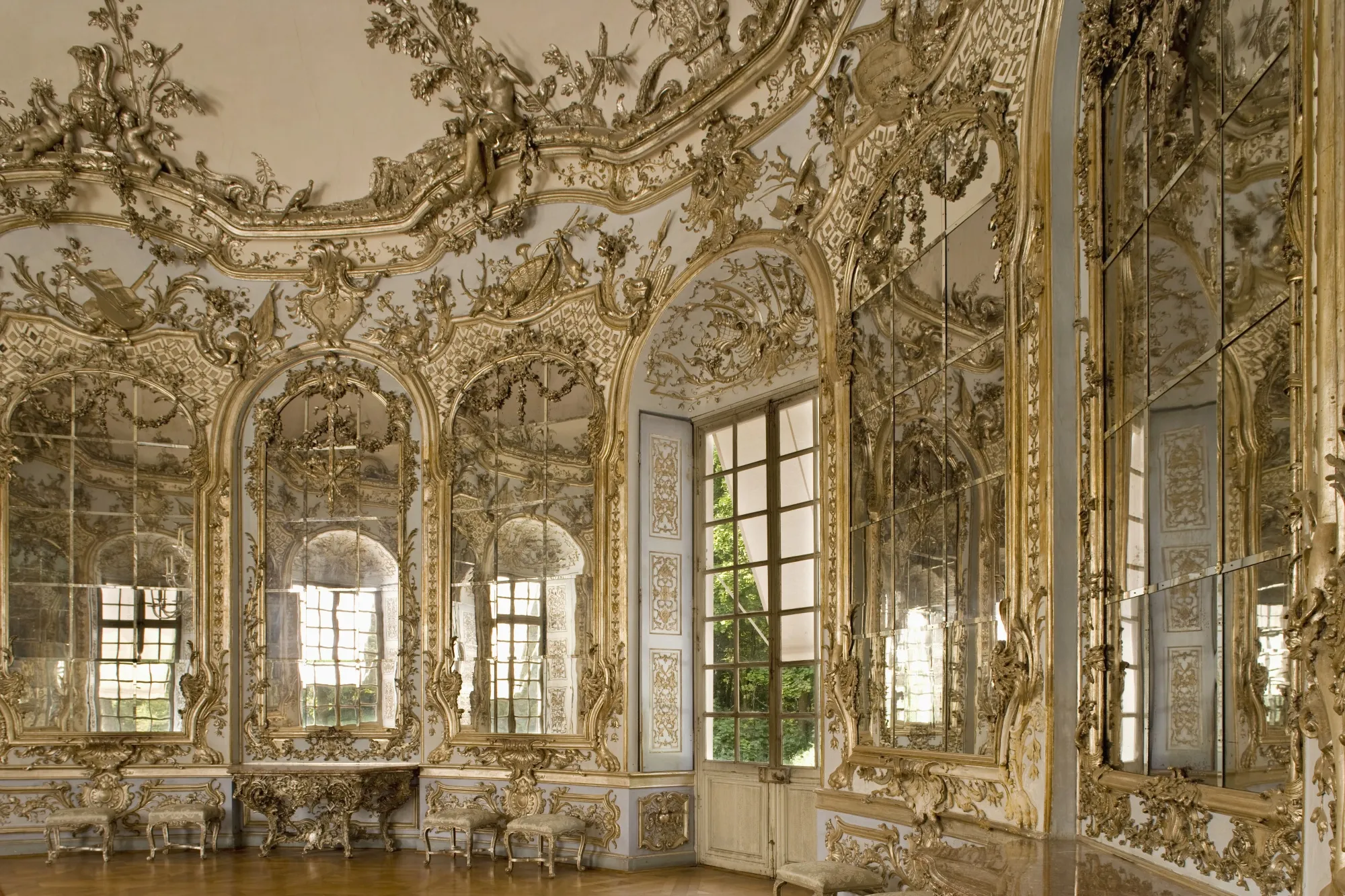 德國慕尼黑寧芬堡宮內的阿瑪琳堡鏡廳。攝影師:Atlantide Phototravel/The Image Bank Unreleased via Getty Images這種藝術精神在慕尼黑阿瑪琳堡等建築中可見一斑,這座建於18世紀30年代的狩獵行宮坐落於巴伐利亞公爵夏宮領地內。其令人目眩的鏡廳裏,鍍銀木雕如藤蔓般沿牆攀爬,隨着高度增加愈發飽滿立體,最終在山形牆上迸發成完全懸離牆面的立體雕塑——丘比特、寧芙女神、漁網與花環交織的盛景。整個空間彷彿被施了賦予生命的魔法,在咒語完成前瞬間凝固。