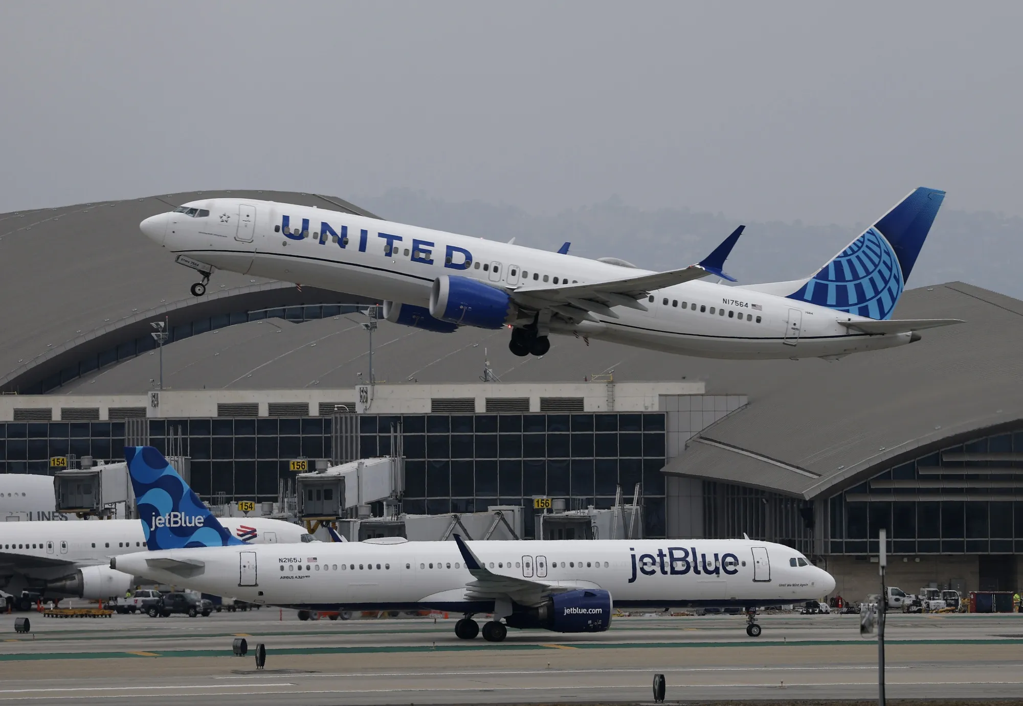 洛杉磯國際機場內一架美聯航與捷藍航空的客機。