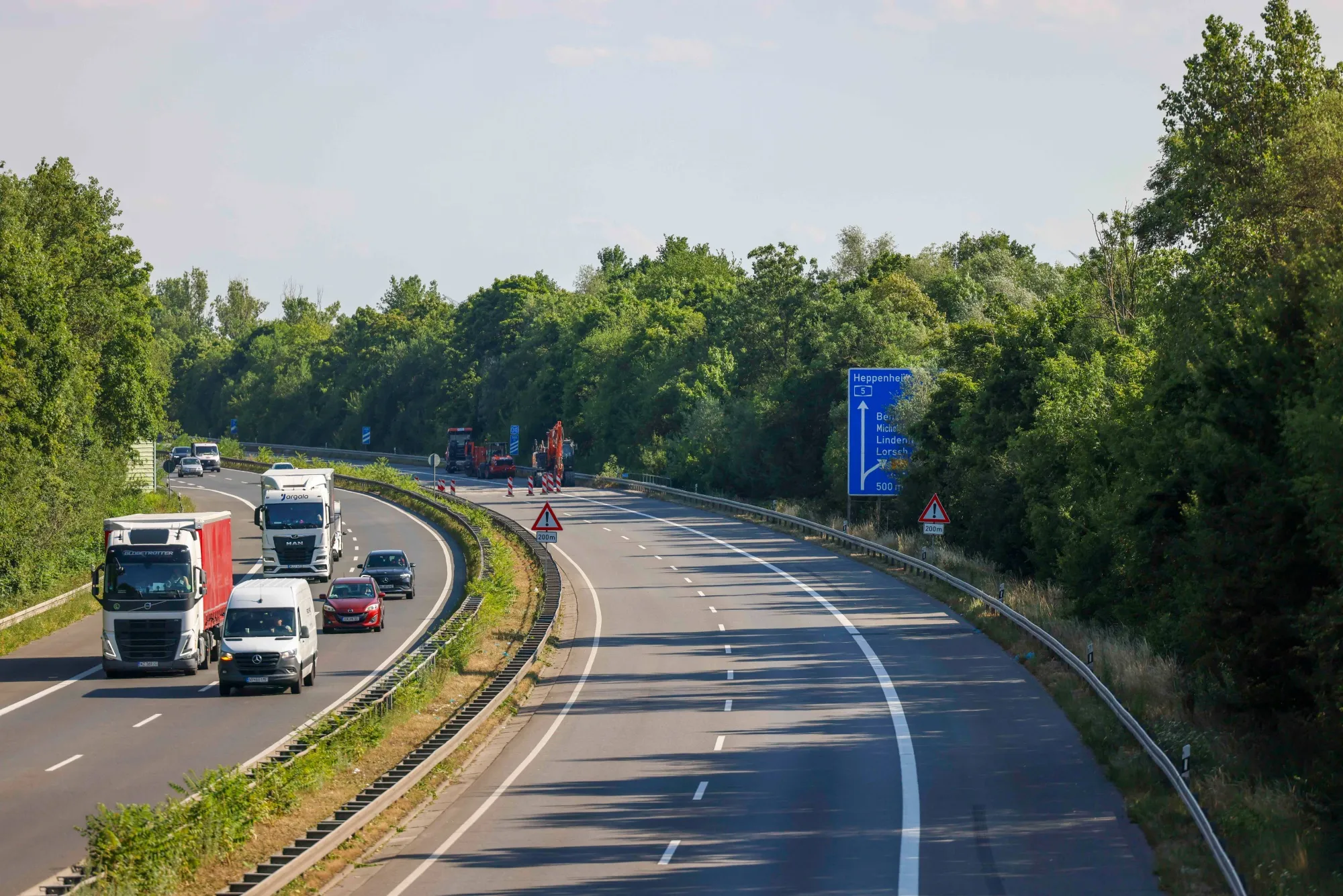 7月3日,工人們正在德國本斯海姆附近修復因高温損壞的A5高速公路路段。攝影師:Michael Probst/美聯社照片德國將於本週末對高速公路進行緊急維修,近日的極端高温導致關鍵路段大面積混凝土爆裂。