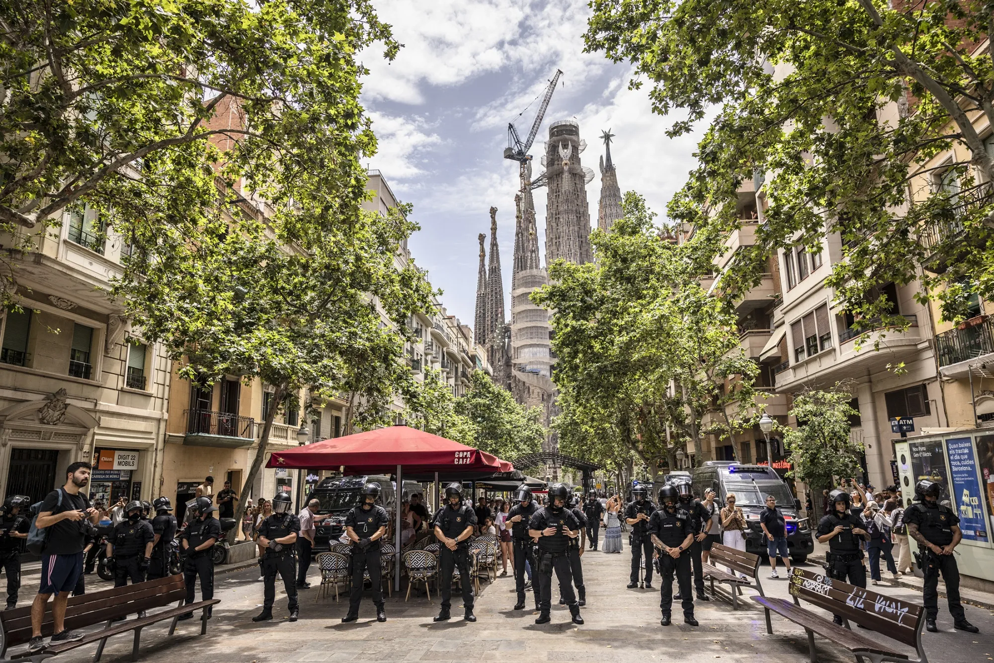 6月15日,巴塞羅那舉行反對旅遊"過度增長"抗議活動期間,防暴警察在現場警戒。攝影師:Angel Garcia/Bloomberg