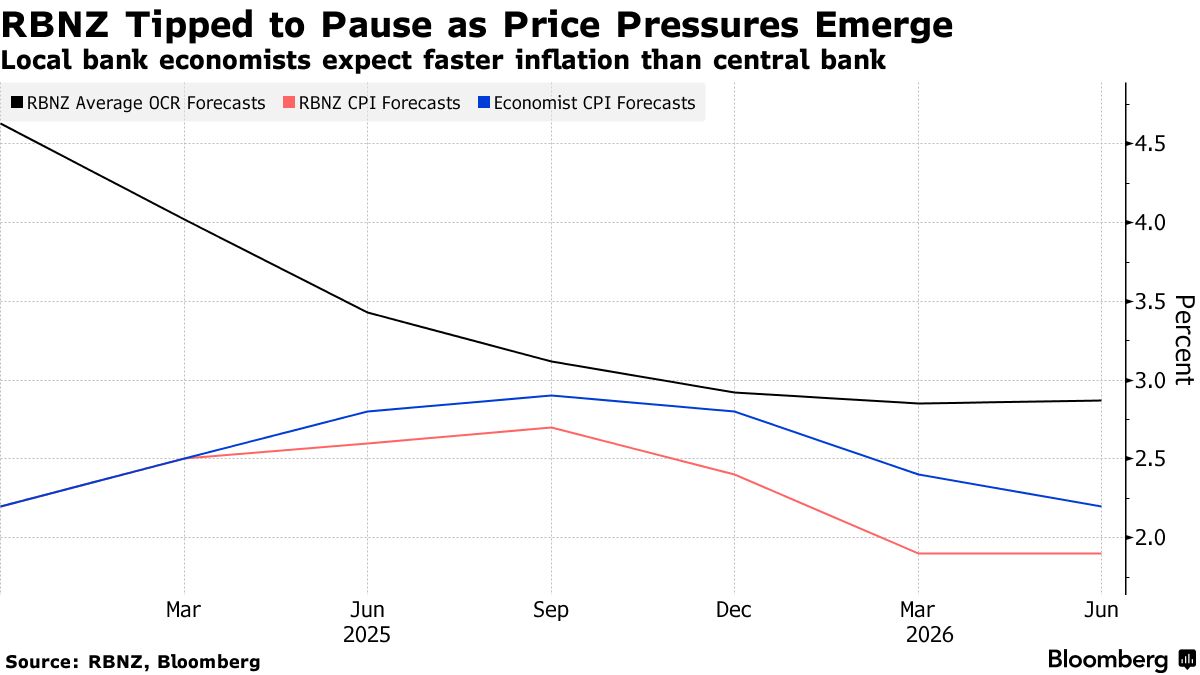自去年8月以來,新西蘭儲備銀行已將其基準利率下調了225個基點,並在5月表示,寬鬆政策的全面影響尚未傳導至家庭。儘管最近的指標顯示經濟增長乏力,但通脹已加速至2.5%,政策制定者對價格預期再次上升持謹慎態度。