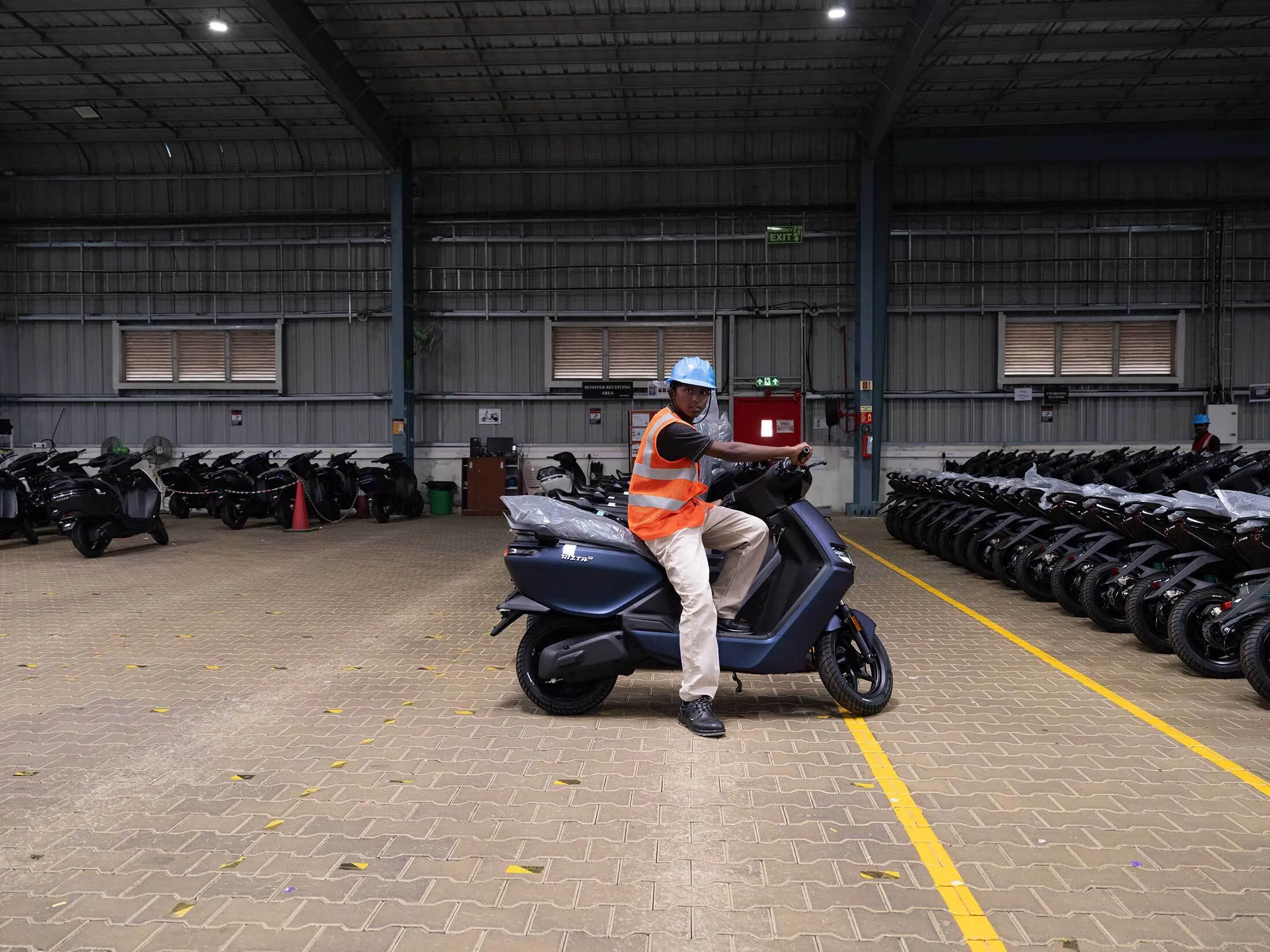 在泰米爾納德邦霍蘇爾的Ather電動車工廠裏,工人正為電動滑板車進行最後調試。