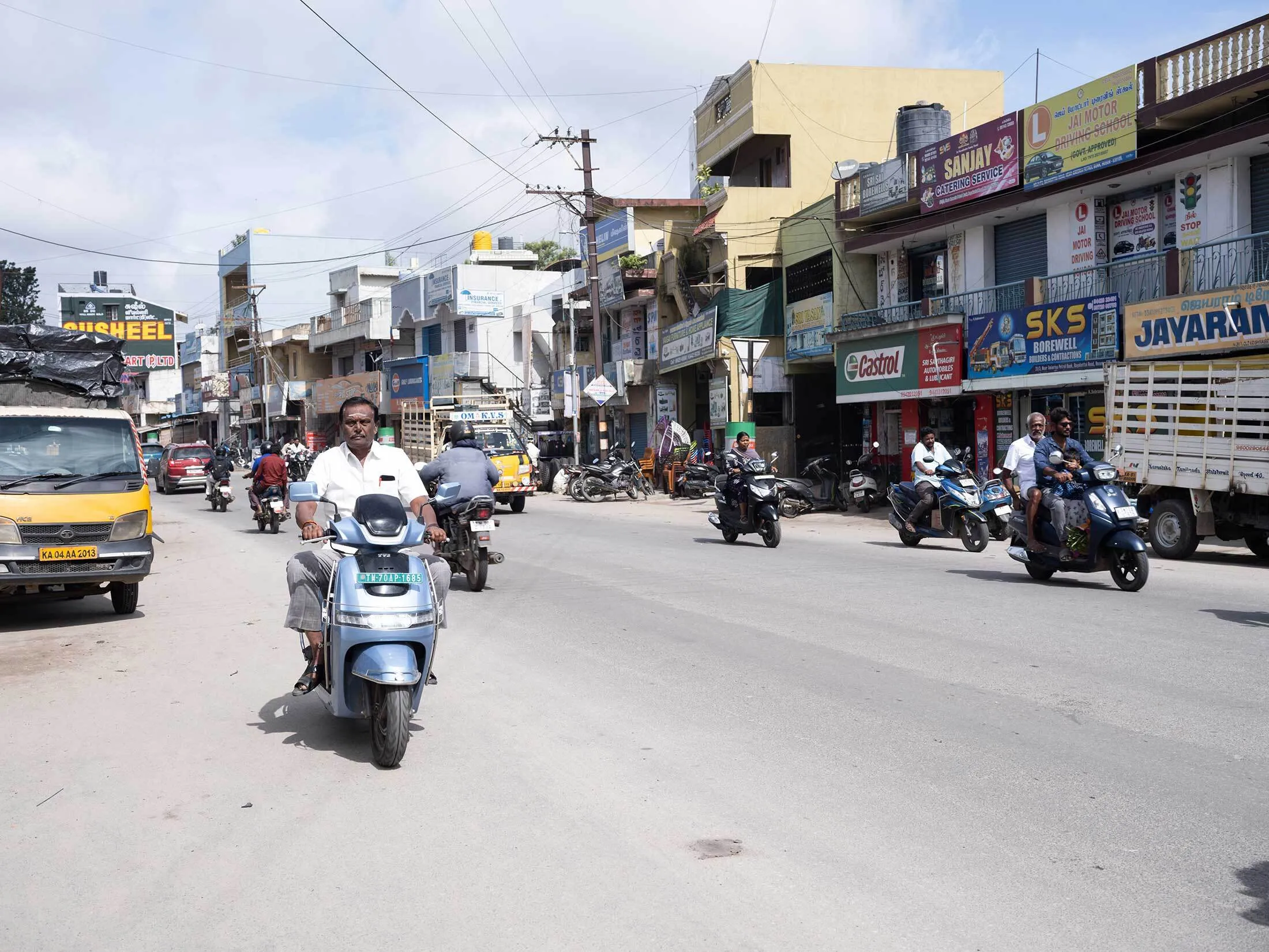 霍蘇爾市中心的主要街道。攝影師:Gayatri Ganju,為《彭博商業週刊》拍攝該設施於2023年12月完工,一個月後開始生產。他表示,公司計劃在未來幾年再投資20億盧比以擴大產能。“三年後起,你乘坐的任何飛機都將裝有來自這個設施的部件,”巴拉蘇布拉馬尼安説。