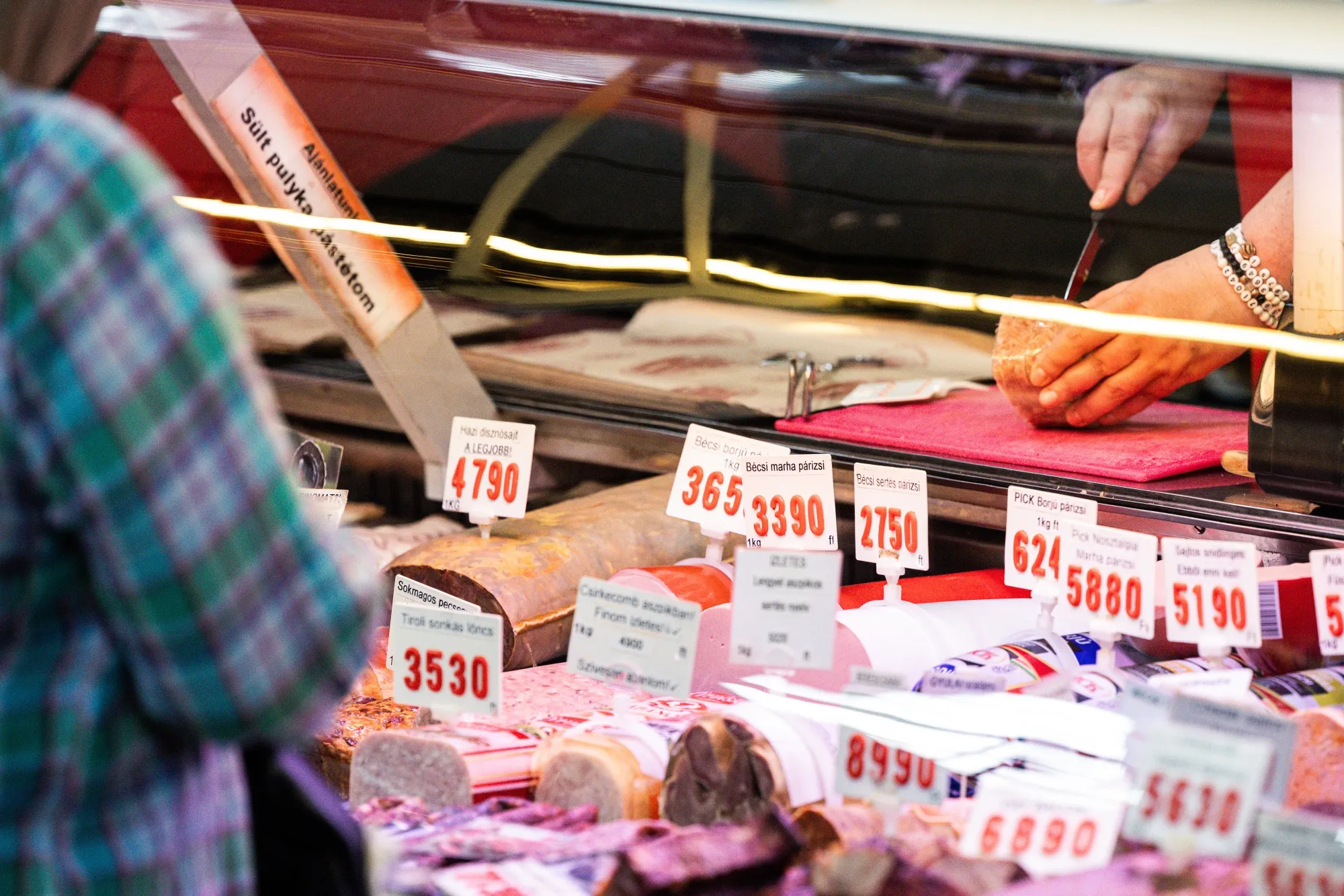 布達佩斯大市場食品市場內的一個肉鋪攤位。