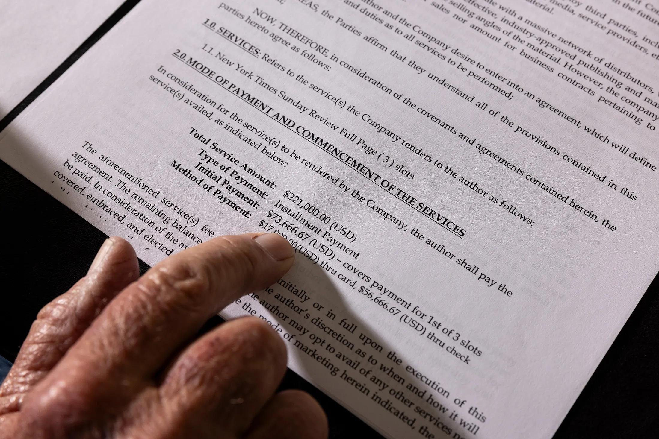 PageTurner的代表開始頻繁來電、發郵件和短信。有時是埃文斯本人,有時是一個自稱凱文·阿德勒的人。他們常帶來好消息,比如環球或索尼想加入合作,或是安娜·德·阿瑪斯和馬特·達蒙表示感興趣。但總伴隨着新的服務費——用於圖書營銷、劇本改編、購買亞馬遜好評等。“他們強調必須積累粉絲和讀者羣,”斯凱沃克説,“這就是他們的誘餌。”五年間,他為這些服務向PageTurner支付了13萬美元,但許多服務從未兑現。最終他未獲分文收益:電影項目擱淺,負債累累,婚姻瀕臨破裂。精疲力竭的他在某天早晨發短信給阿德勒説要退出。“如果我真是拍電影的料,就不會有這些問題,”他寫道,“替我回絕Netflix和環球吧。”