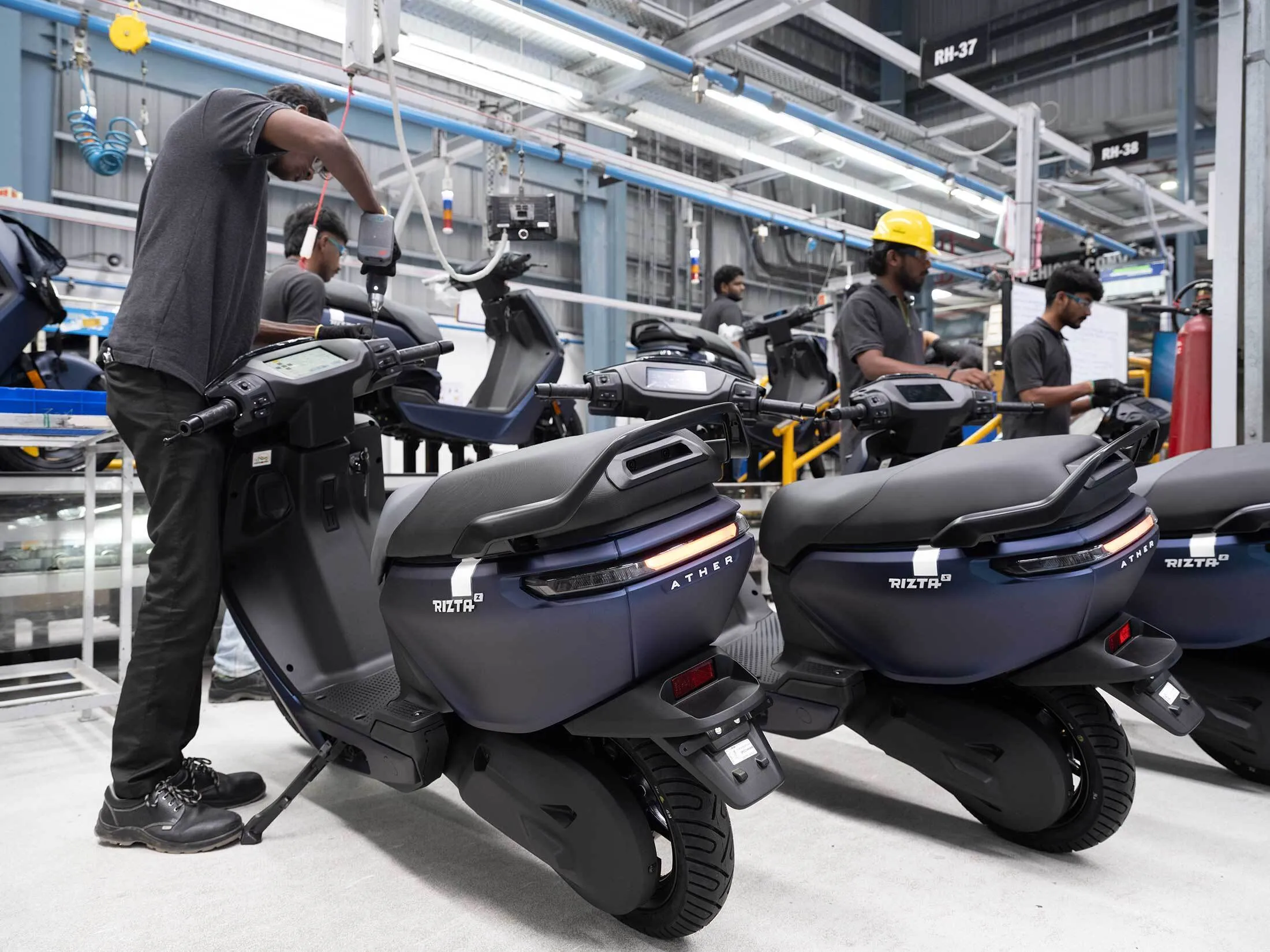 在泰米爾納德邦霍蘇爾的Ather電動車工廠進行滑板車最後組裝工序攝影師:Gayatri Ganju為《彭博商業週刊》拍攝在印度科技之都班加羅爾的辦公室裏,林本傑明能望見以企業命名的高架地鐵站。這家台灣電子元件製造商斥資6.5億盧比(750萬美元)取得冠名權,旨在讓每日穿梭於Delta電子Bommasandra站的數千乘客看到:公司正參與塑造這座城市的未來。