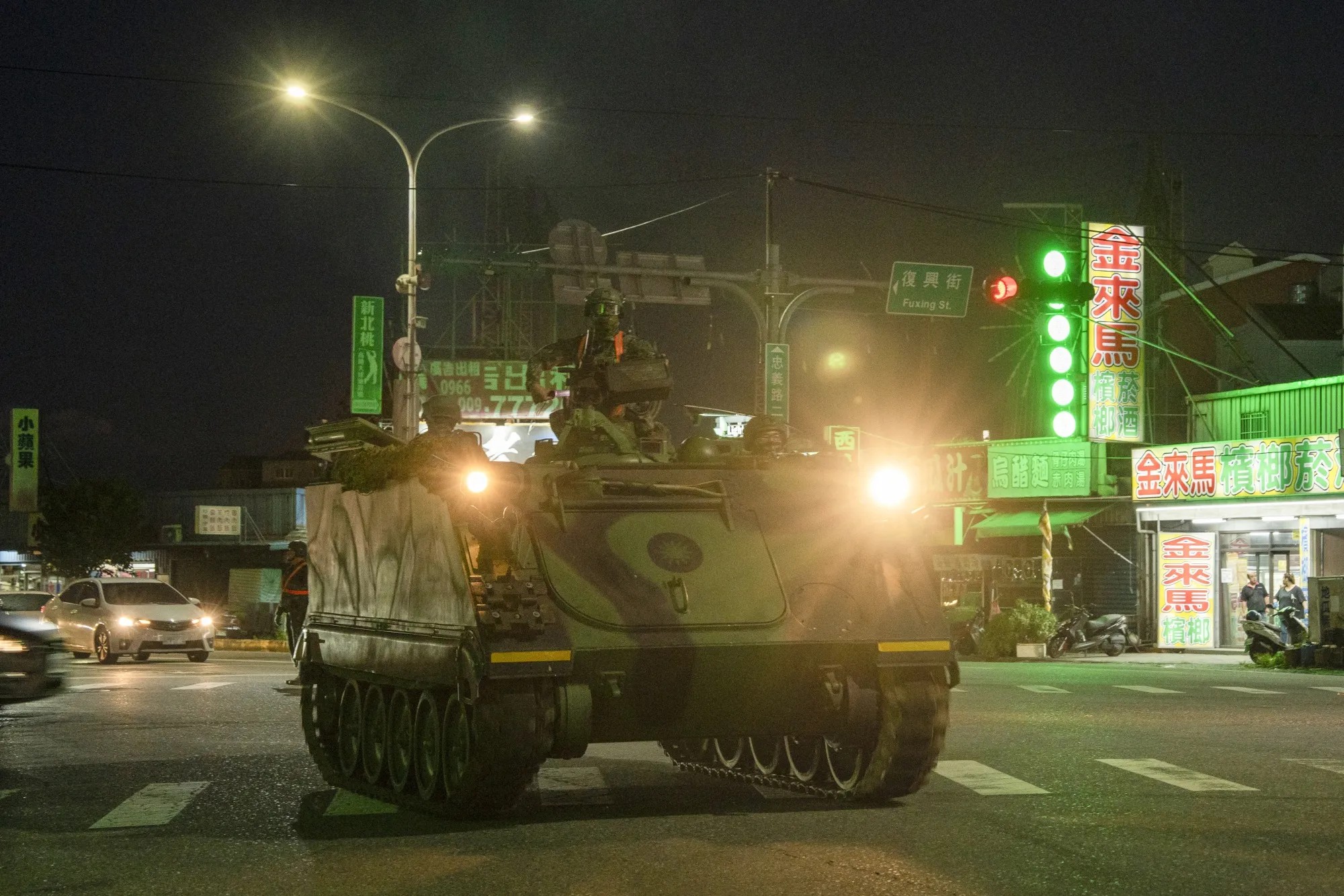 2024年漢光軍演期間,台灣桃園的一輛裝甲運兵車。攝影師:Justin Chan/AFP/Getty Images台灣正準備啓動其有史以來規模最大的年度軍事演習——這凸顯了總統賴清德保護這個自治民主政體免受中國強勢影響的決心。