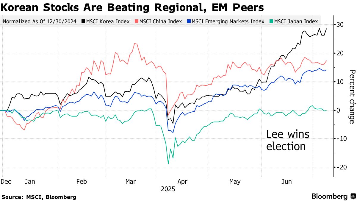 基準的韓國綜合股價指數今年已上漲30%,成為2025年全球表現最佳的股指之一。在李明博總統當選前後,全球基金於5月和6月向韓國股市注入了約30億美元。李明博政府正加大力度提升公司治理標準和股票估值水平。