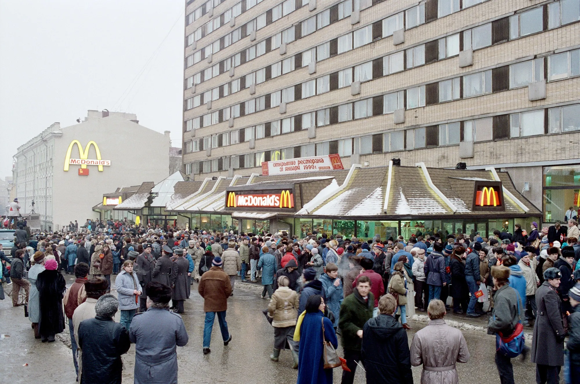 1990年莫斯科普希金廣場的俄羅斯首家麥當勞。攝影師:保羅·馬西/Mirrorpix/Getty Images關係緩和可能改變當前態勢,重現冷戰末期西方商品受追捧的景象。1990年冬,數萬民眾曾排隊數小時光顧莫斯科普希金廣場的俄羅斯首家麥當勞。