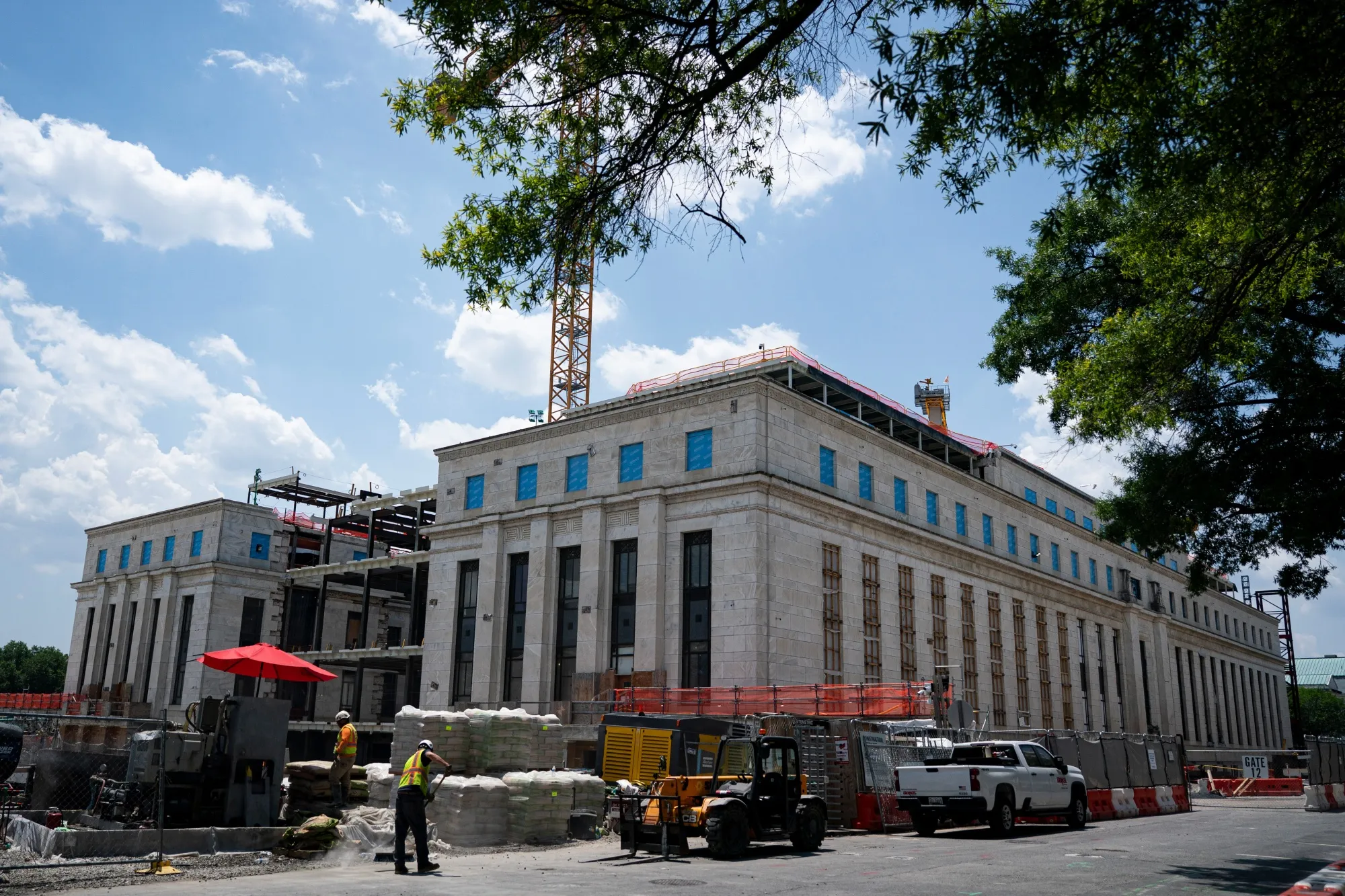 2025年6月25日星期三,華盛頓美聯儲馬瑞納·S·埃克爾斯大樓的施工情況。照片:阿爾·德拉戈/彭博社“沒有VIP餐廳,沒有新的大理石,”鮑威爾在6月25日的證詞中説。“沒有特殊電梯——只有一直存在的舊電梯,沒有新的噴泉,沒有蜂箱,也沒有屋頂花園。”