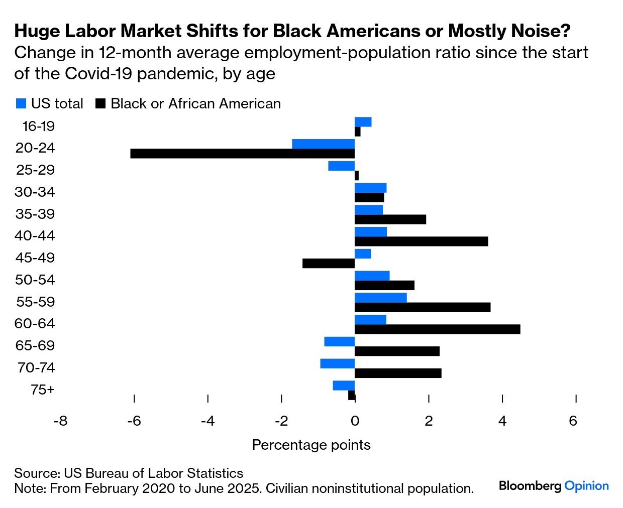 彭博社觀點專欄當下美國青少年的汽車消費正成為搖錢樹共和黨期待其精心設計的法案經得起時間考驗90億美元AI併購案中總有人要當冤大頭深陷財政泥潭的國會仍在繼續挖坑但兩張圖表共同揭示了過去一年間的分化現象:整體就業形勢依然健康,但非裔羣體數據持續疲軟。潛在驅動因素是什麼?特朗普總統打壓多元化、公平與包容計劃,以及縮減非裔員工佔比偏高的聯邦公務員規模的政策可能產生了影響。但非裔就業下滑早於其就任時間點,這令人懷疑可能是勞動力市場深層疲軟的早期徵兆。